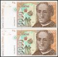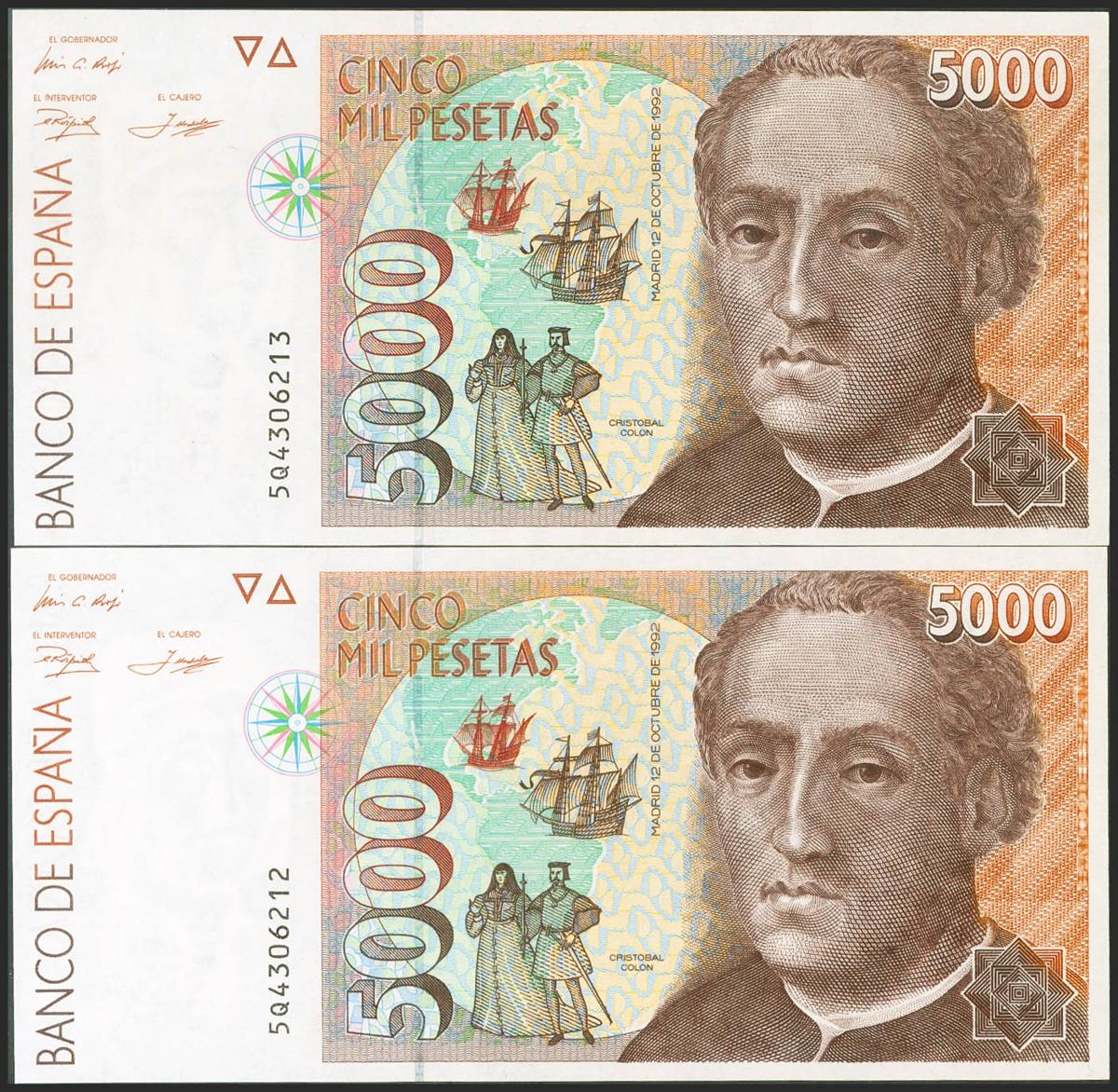 5000 Pesetas. 12 de Octubre de 1992. Pareja correlativa. Serie 5Q. (Edifil 2021: 484a). SC.