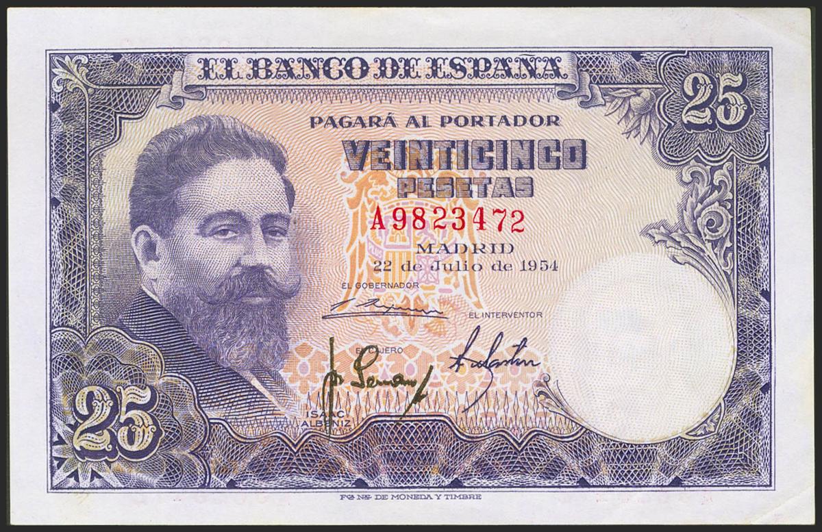 25 Pesetas. 22 de Julio de 1954. Serie A. (Edifil 2021: 467a). Conserva todo su apresto original. SC--.