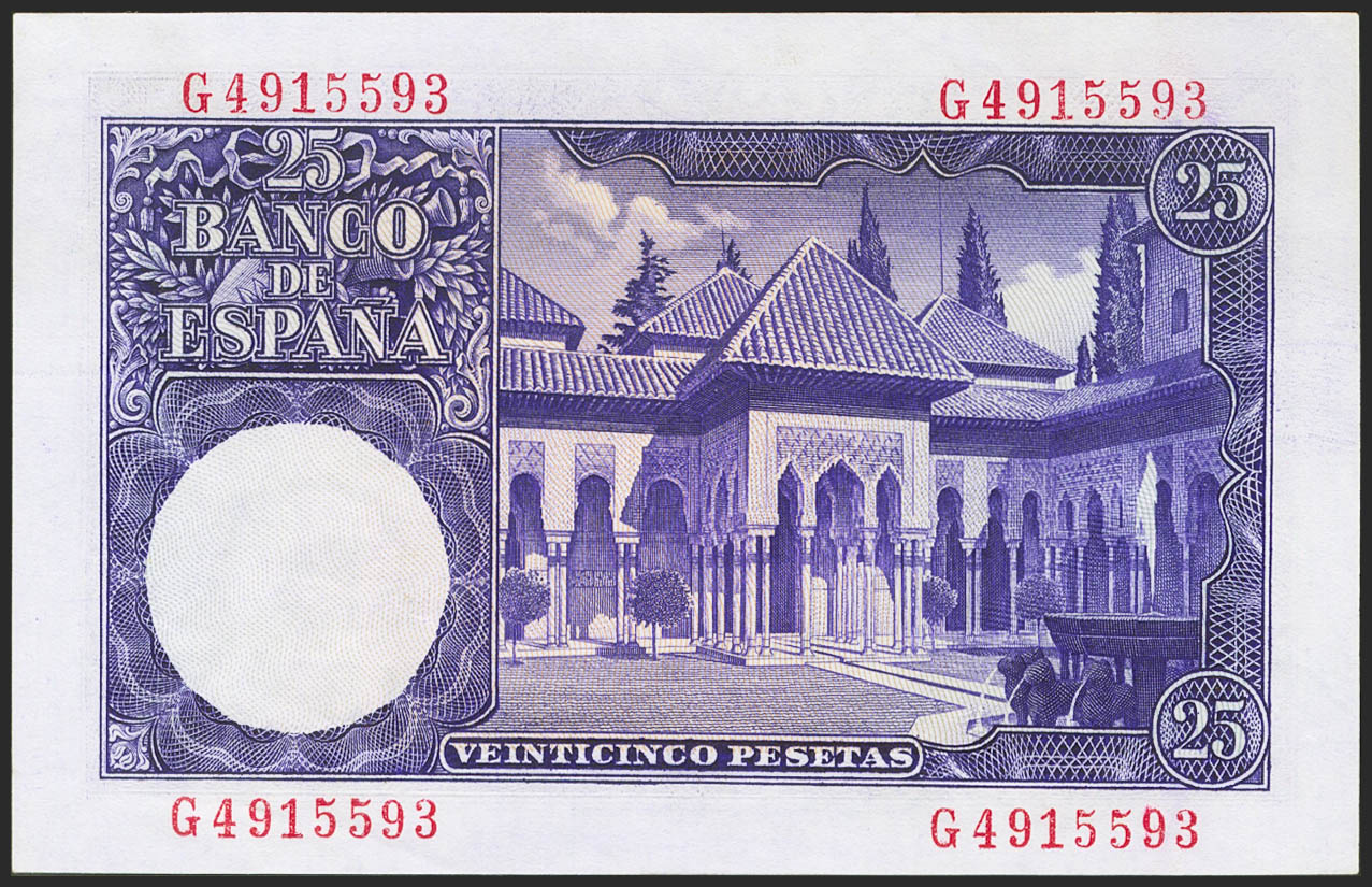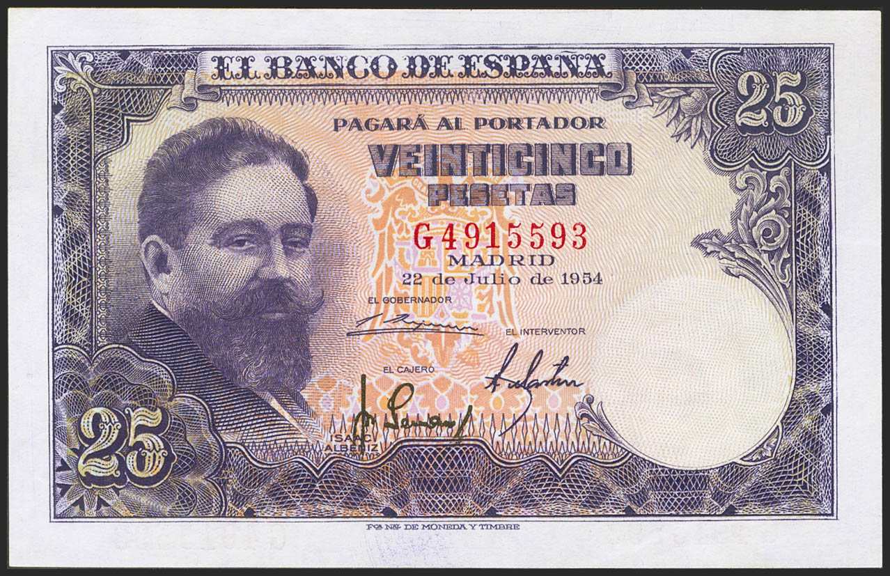 25 Pesetas. 22 de Julio de 1954. Serie G. (Edifil 2021: 467a). Conserva todo su apresto original. SC-.