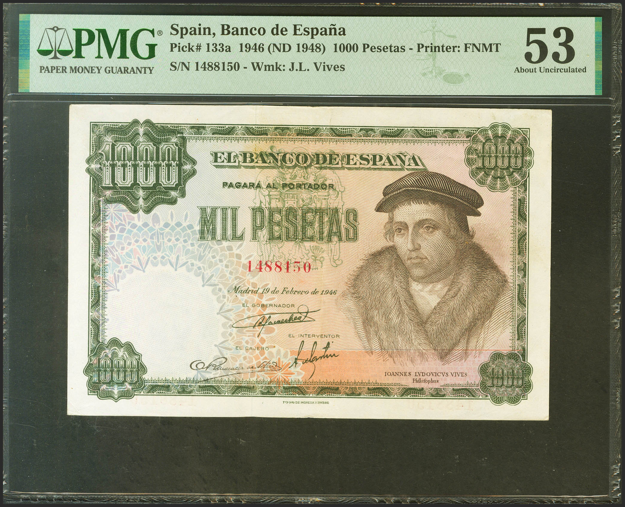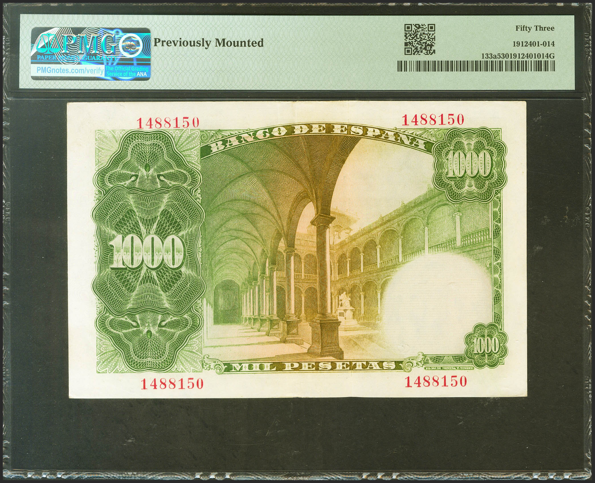 1000 Pesetas. 19 de Febrero de 1946. Sin serie. (Edifil 2017: 453). Inusual en esta calidad. EBC+. Encapsulado PMG53 (previously mounted).