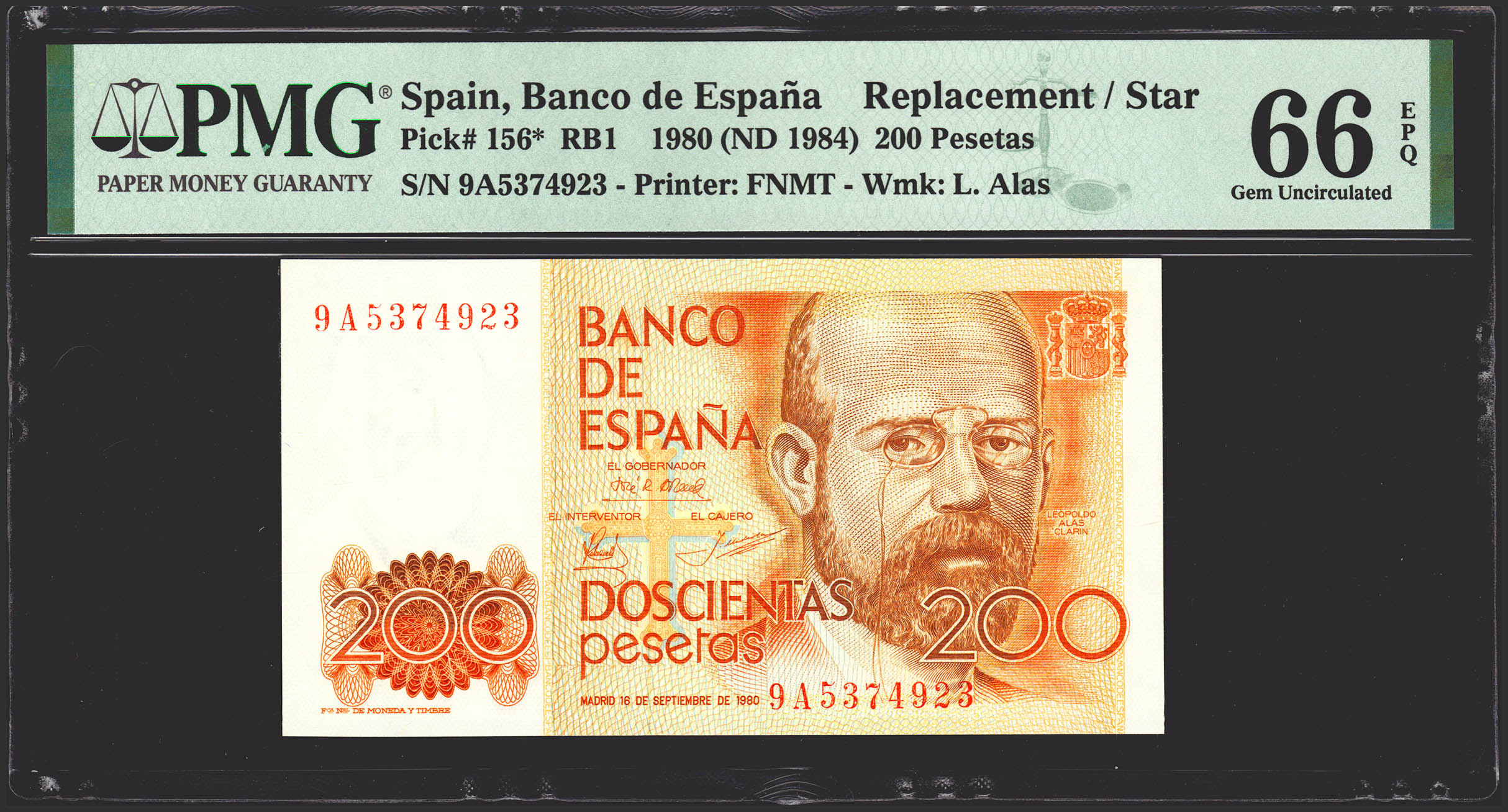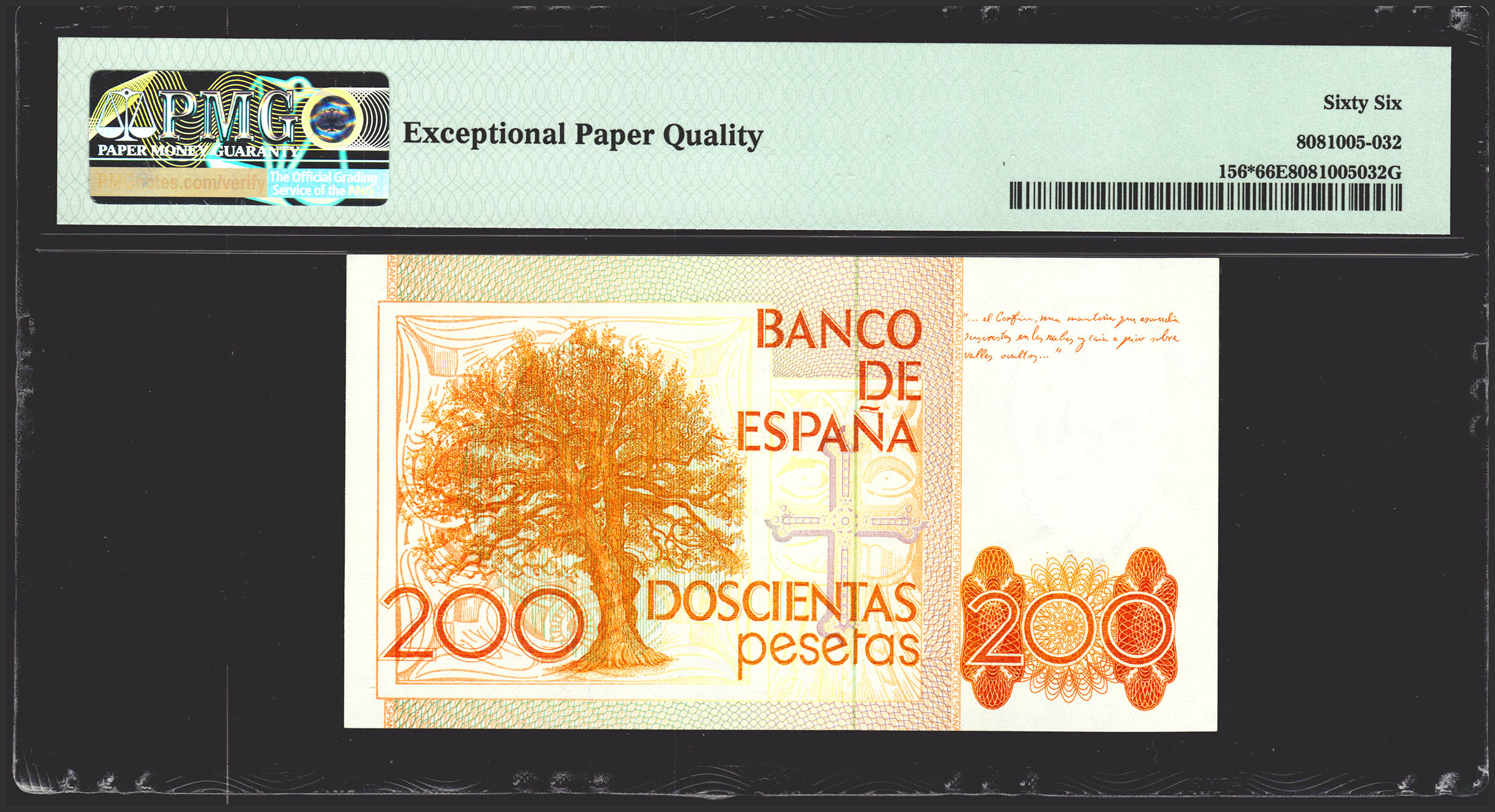 200 Pesetas. 16 de Septiembre de 1980. Serie especial 9A. (Edifil 2021: 480b, Pick: 156*). Inusual en esta excepcional calidad. SC. Encapsulado PMG66EPQ.