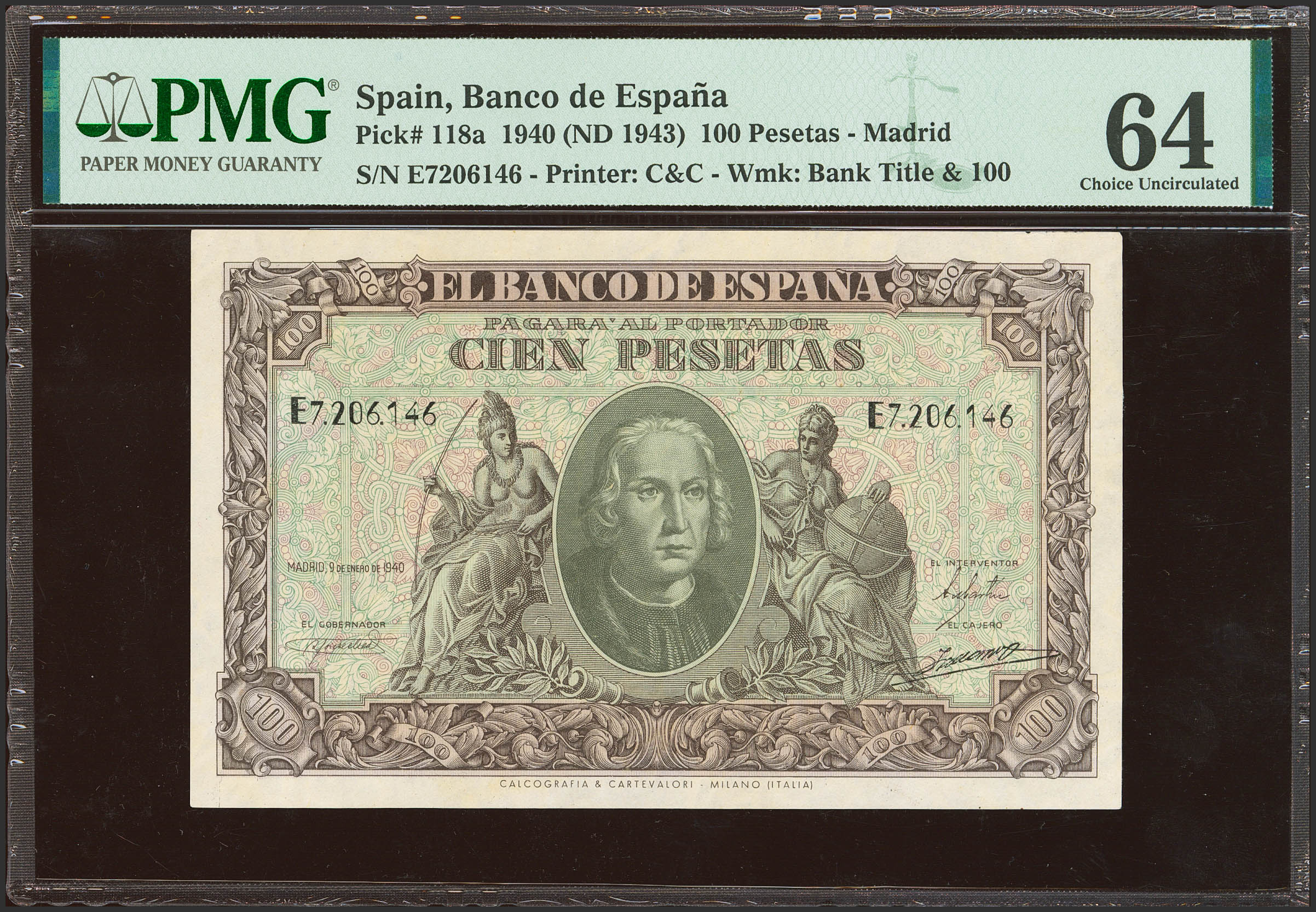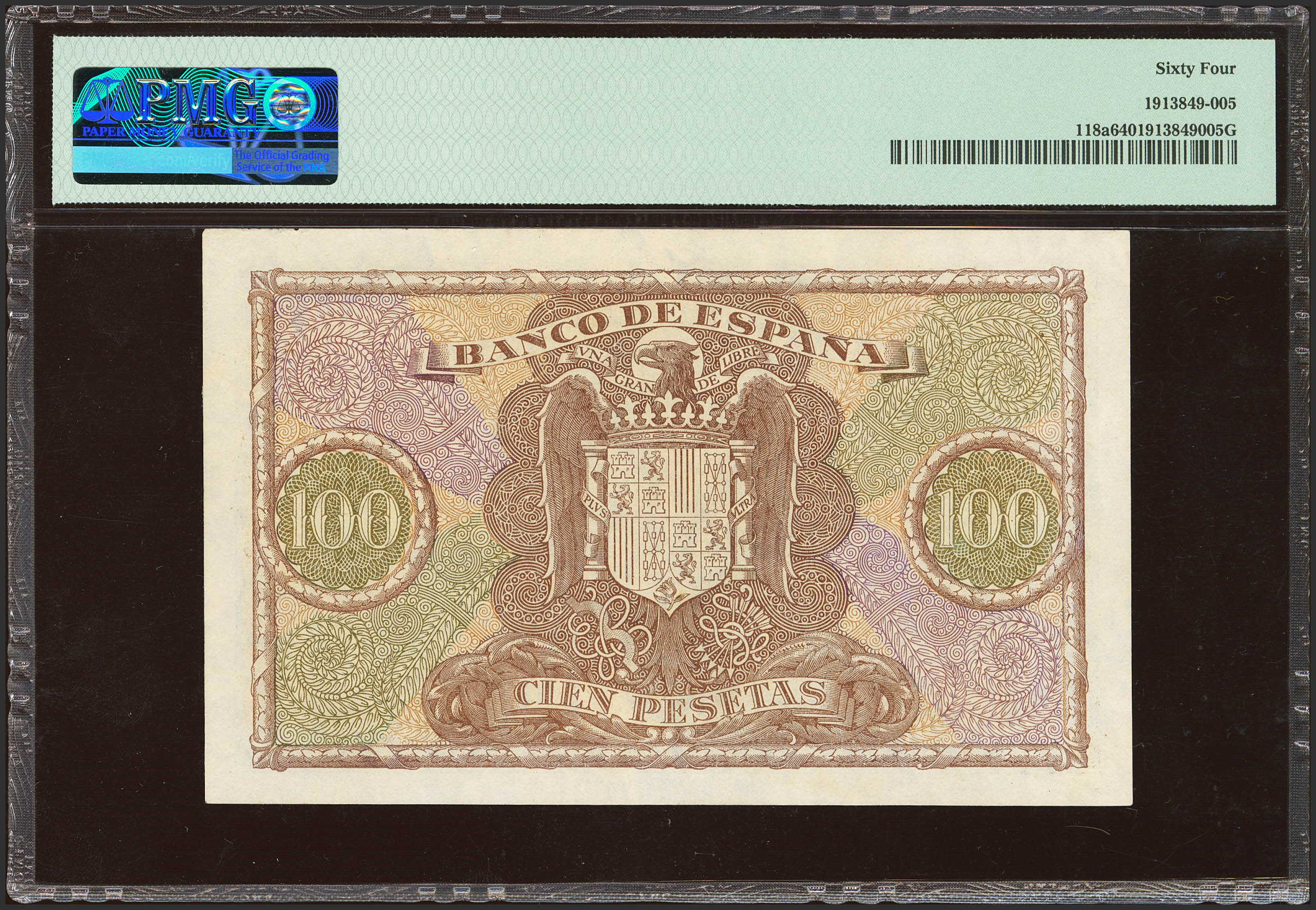 100 Pesetas. 9 de Enero de 1940. Serie E. (Edifil 2021: 438a, Pick: 118a). Inusual en esta calidad. SC. Encapsulado PMG64.