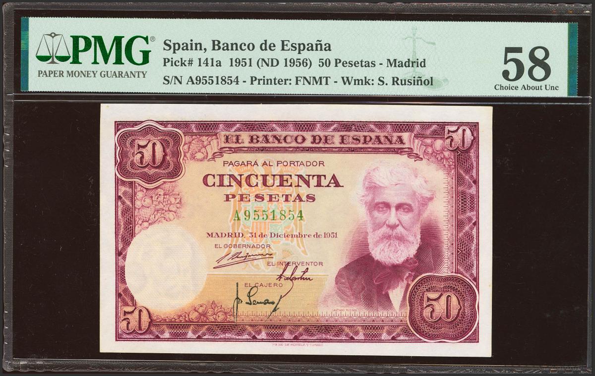 50 Pesetas. 31 de Diciembre de 1951. Serie A. (Edifil 2021: 462a, Pick: 141a). EBC++. Encapsulado PMG58.