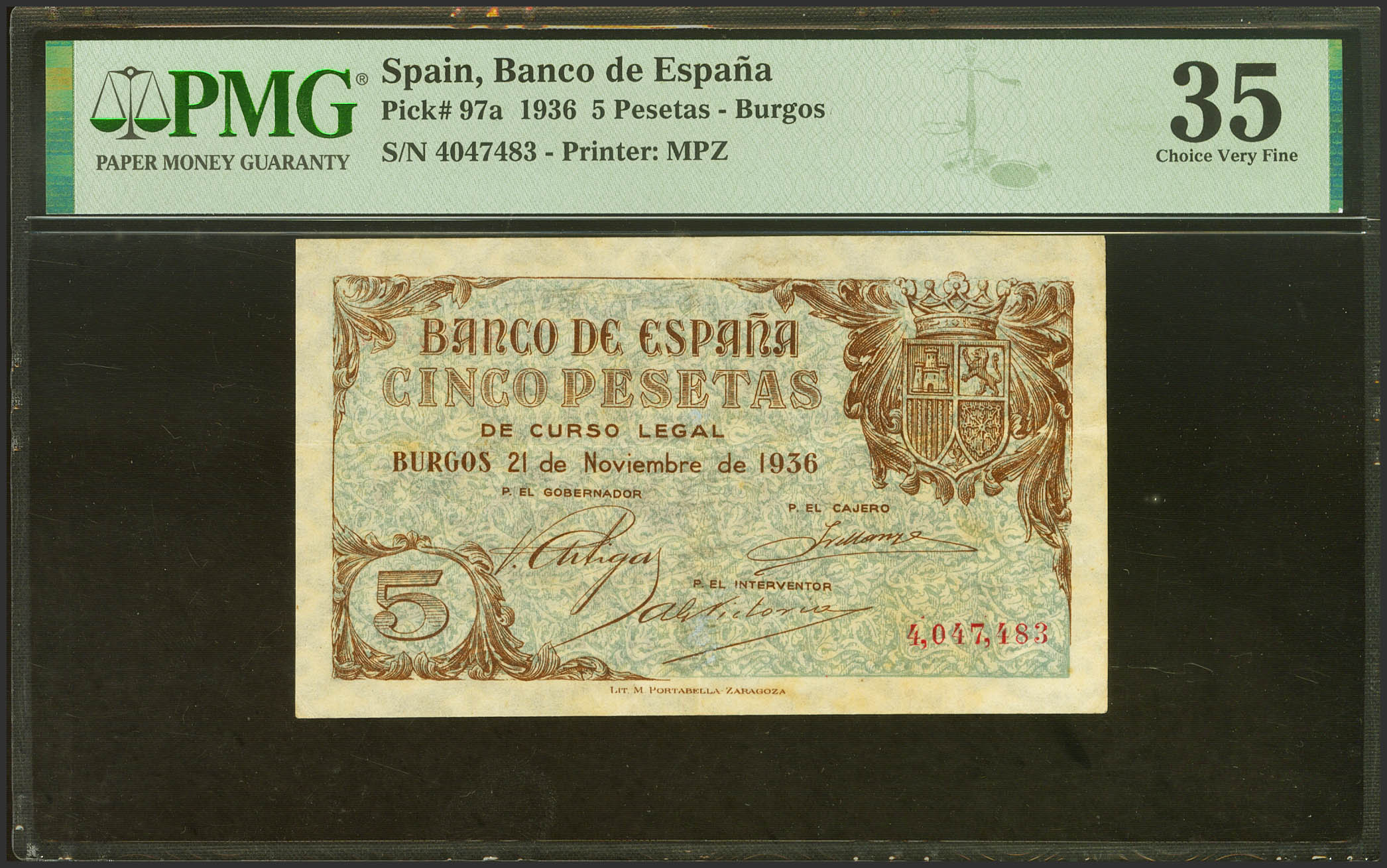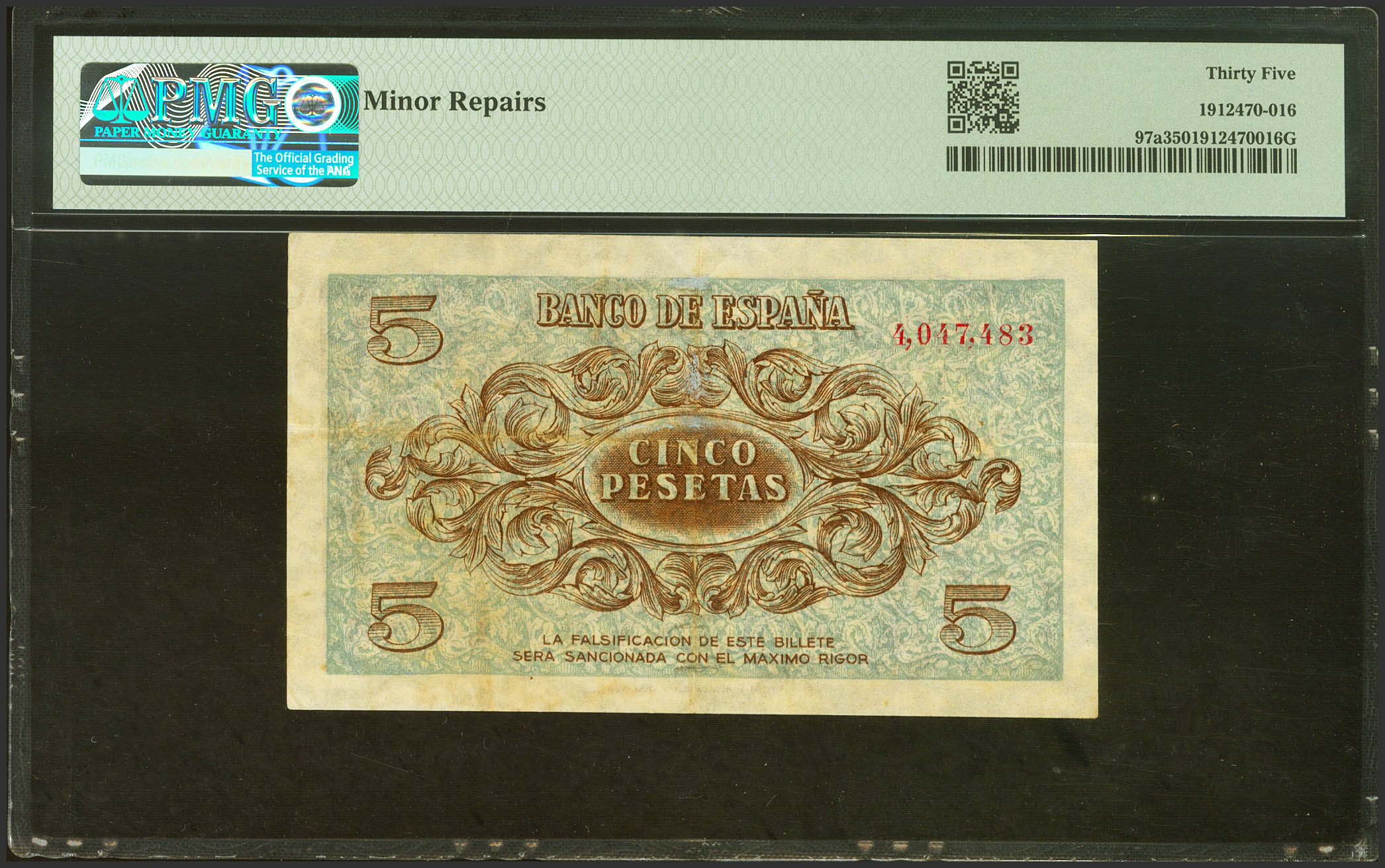 5 Pesetas. 21 de Noviembre de 1936. Sin serie. (Edifil 2021: 417, Pick: 97a). Inusual, mÃnimamente reparado. MBC+. Encapsulado PMG35.