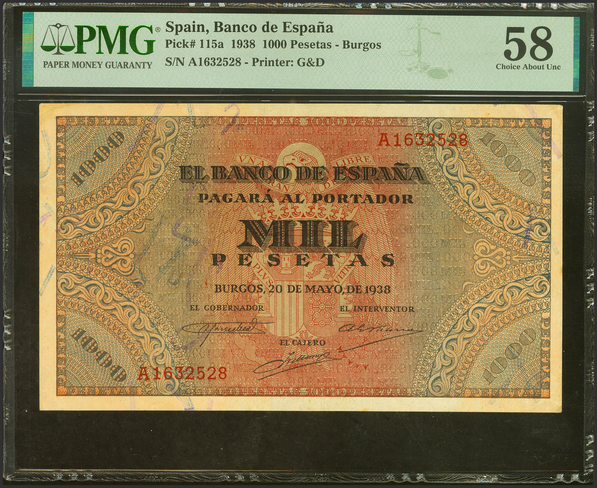 1000 Pesetas. 20 de Mayo de 1938. Serie A. (Edifil 2017: 434, Pick: 115a). Inusual en esta excepcional calidad. EBC++. Encapsulado PMG58 (minor foreign substance).