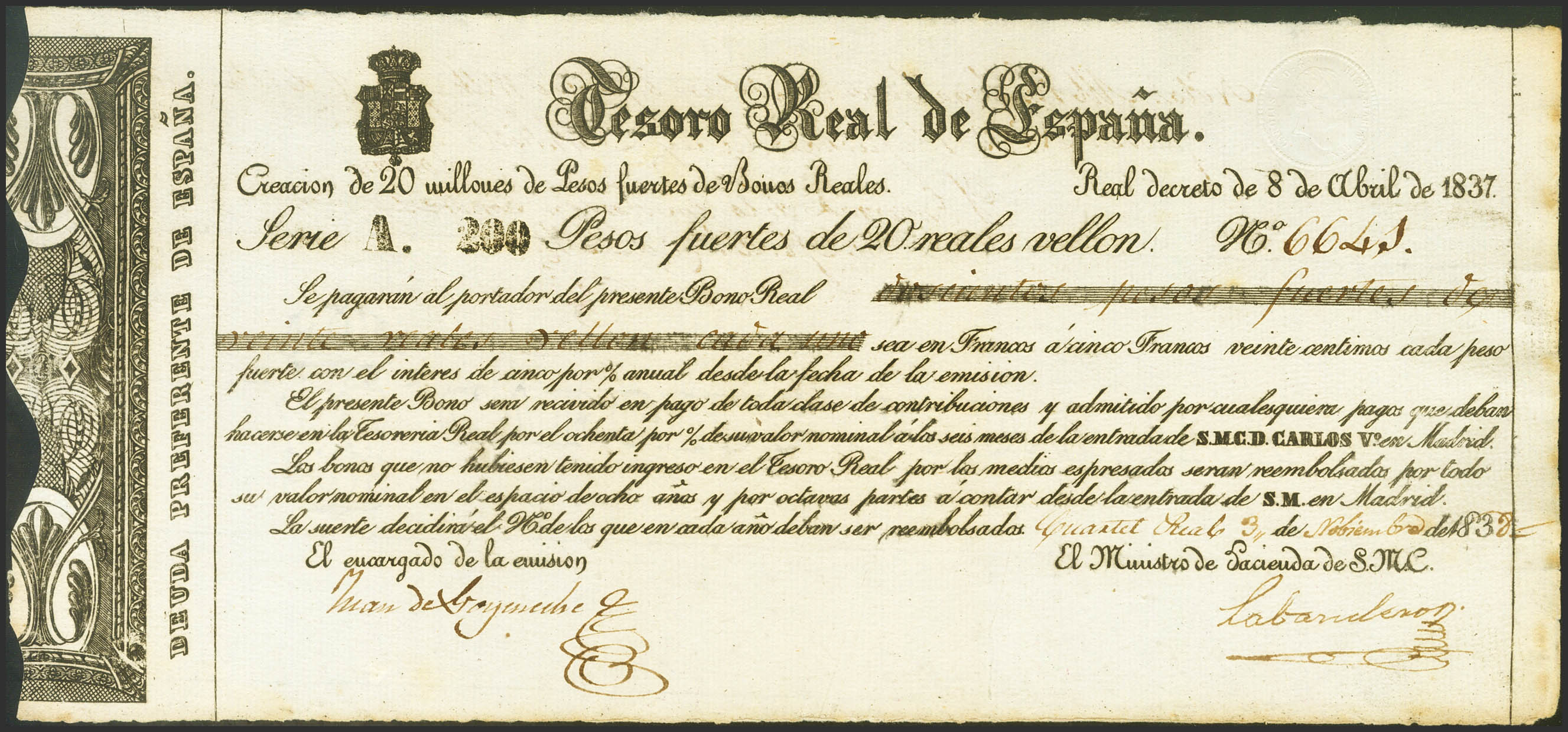 200 Pesos Fuertes de 20 Reales de Vellón. Tesoro Real de España. 8 de Abril de 1837. Serie A. (Edifil 2021: 23). Raro, especialmente en esta excepcional calidad. SC--.