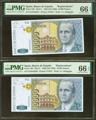 10000 Pesetas. 12 de Octubre de 1992. Pareja correlativa. Serie especial 9A. (Edifil 2023: 485b, Pick: 166*). Rara en esta excepcional calidad. SC. Encapsulados PMG66EPQ, ambos.