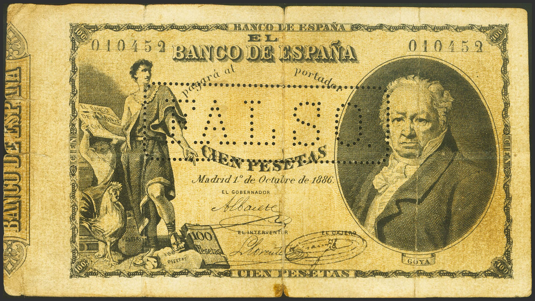 100 Pesetas. 1 de Octubre de 1886. Falso de Epoca. Sin serie y perforado FALSO. (Edifil 2021: 294). Muy raro. MBC-.