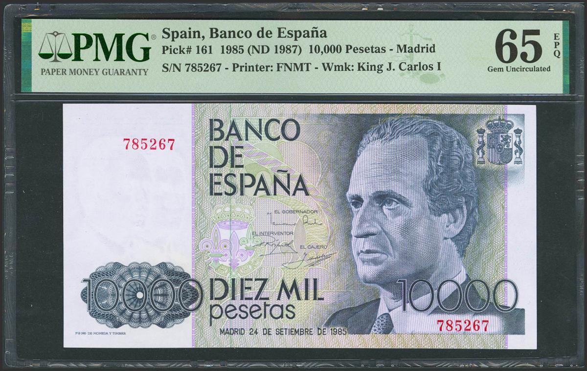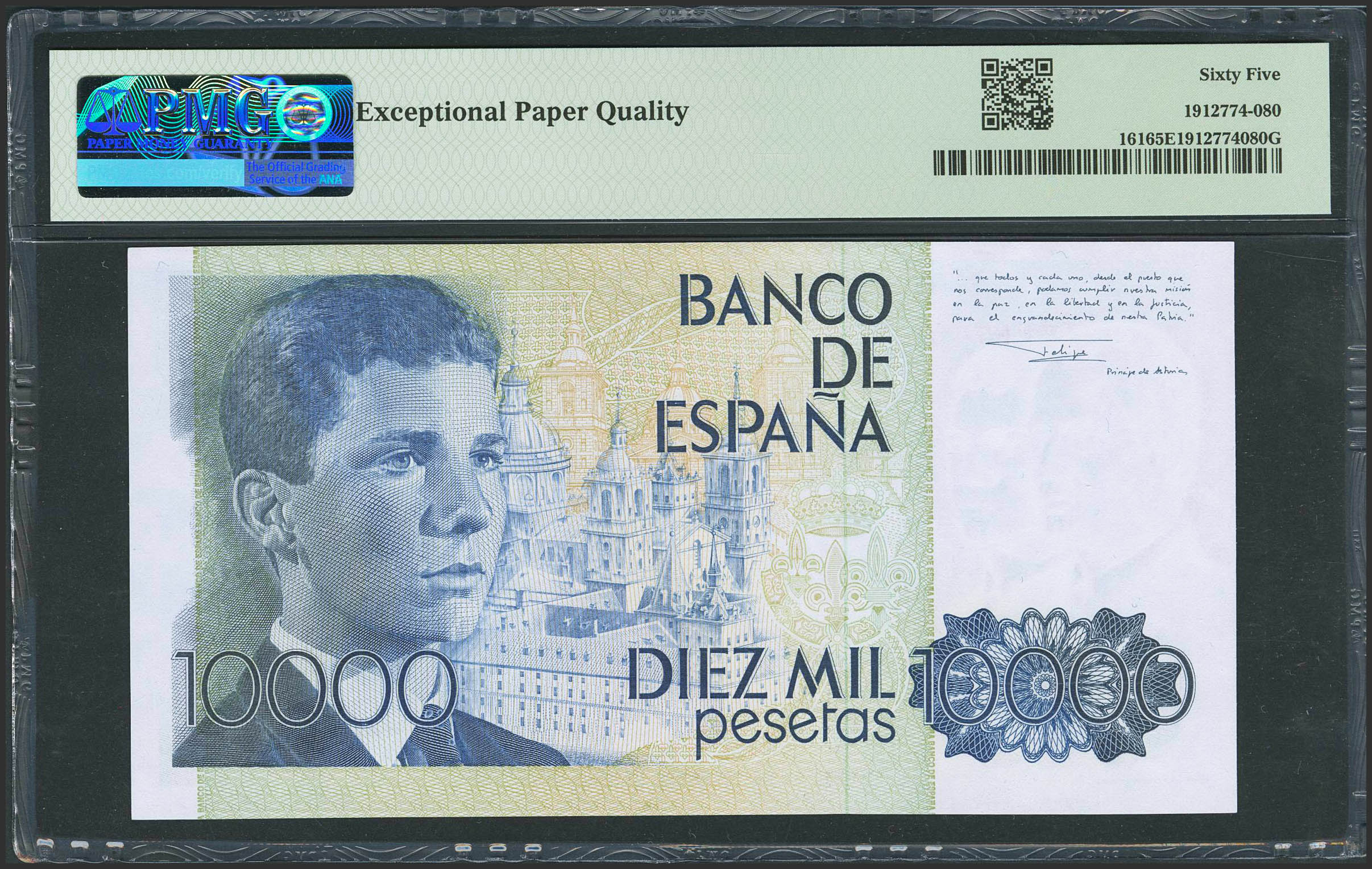 10000 Pesetas. 24 de Septiembre de 1985. Sin serie. (Edifil 2021: 481, Pick: 161). Inusual en esta excepcional calidad. SC. Encapsulado PMG65EPQ.
