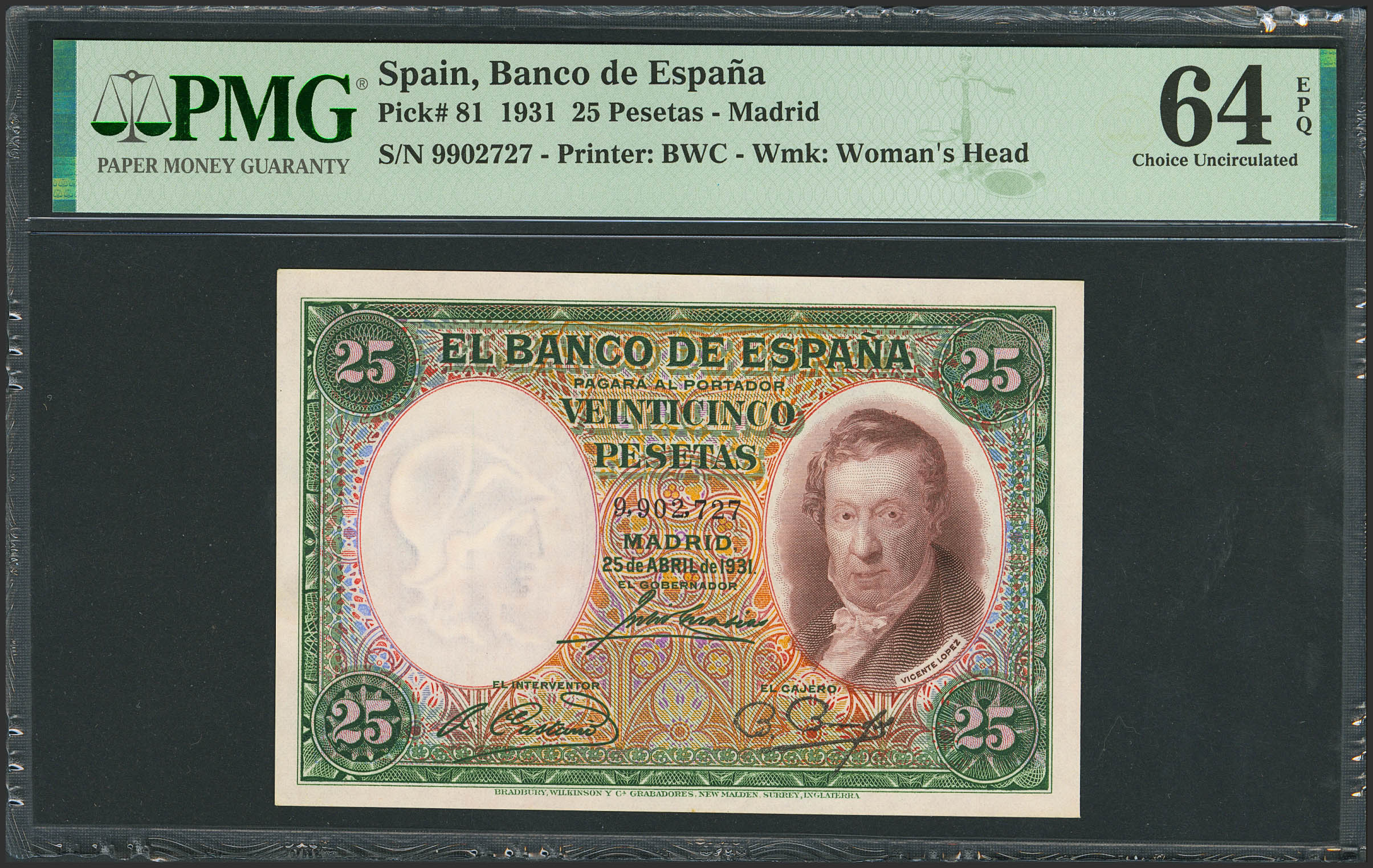 25 Pesetas. 25 de Abril de 1931. Sin serie. (Edifil 2021: 358, Pick: 81). Apresto original. SC. Encapsulado PMG64EPQ.