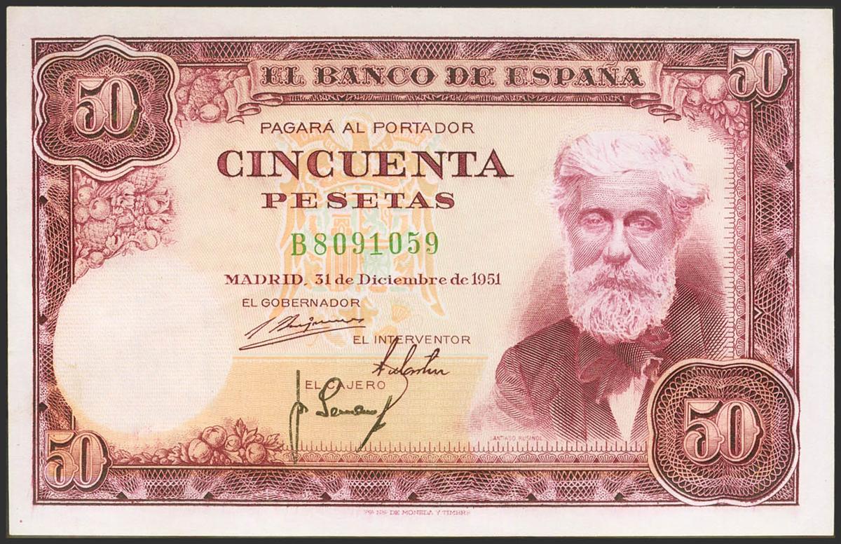 50 Pesetas. 31 de Diciembre de 1951. Serie B. (Edifil 2021: 462a). Conserva todo el apresto original. SC--.
