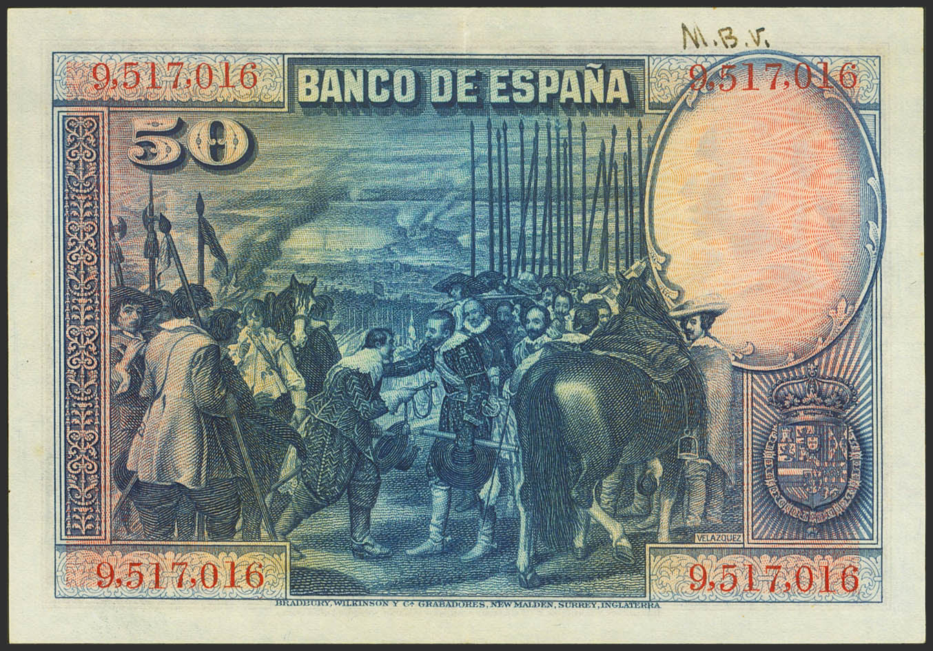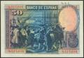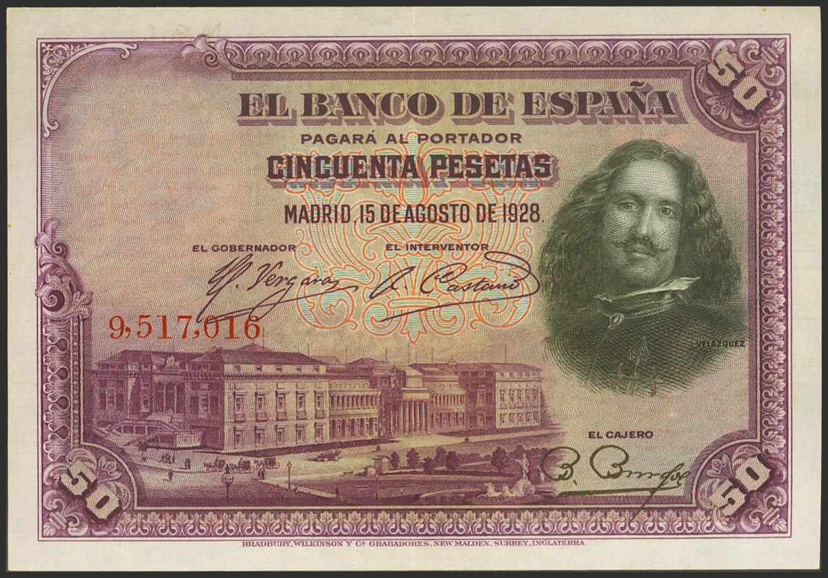 50 Pesetas. 15 de Agosto de 1928. Sin serie. (Edifil 2023: 329). Inusual, reverso manuscrito en la margen superior. EBC-.