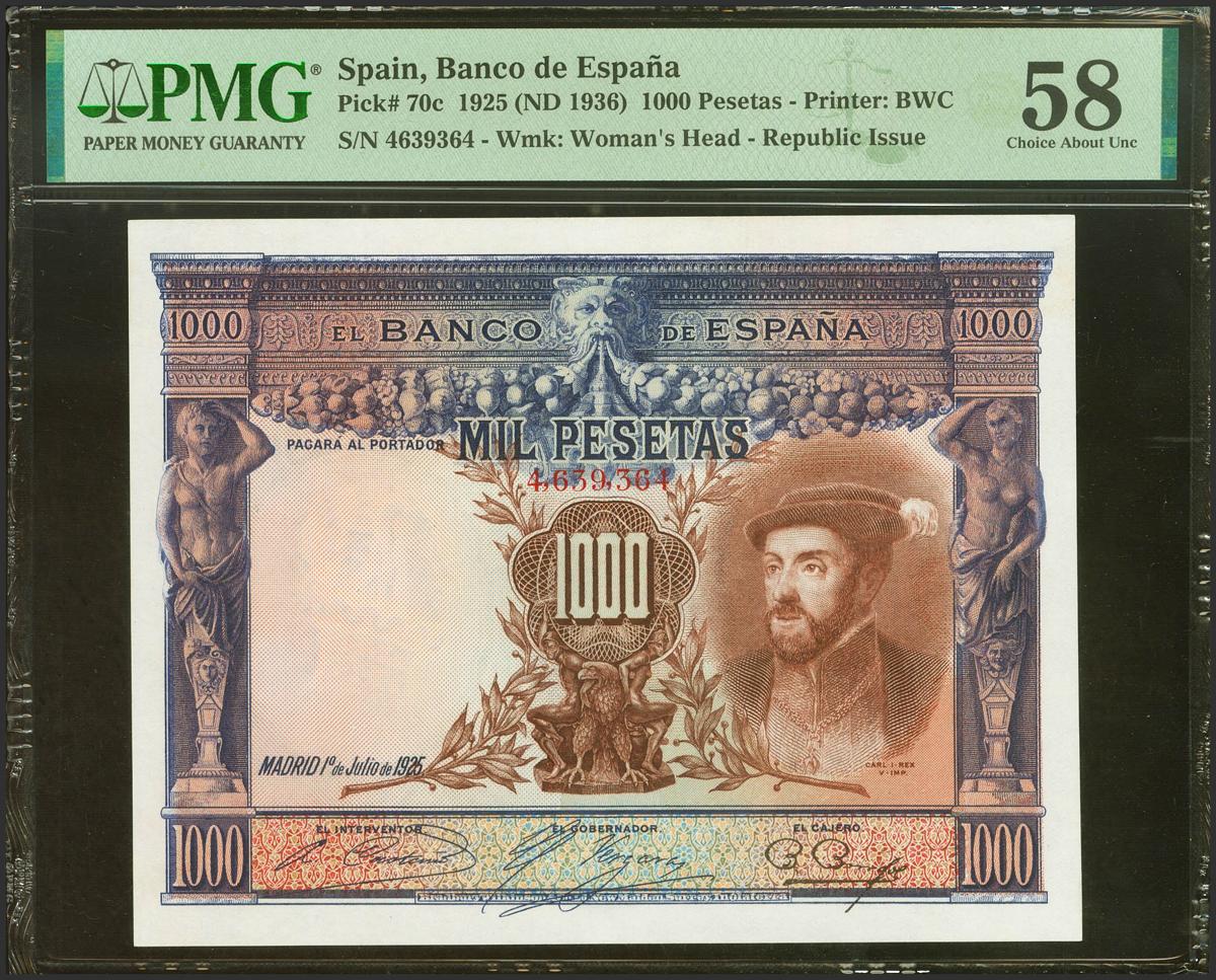 1000 Pesetas. 1 de Julio de 1925. Sin serie y numeración capicúa superior al 3646000. (Edifil 2023: 351, Pick: 70c). Inusual en esta calidad, puntitos de aguja. EBC++. Encapsulado PMG58 (radar serial number, pinholes).