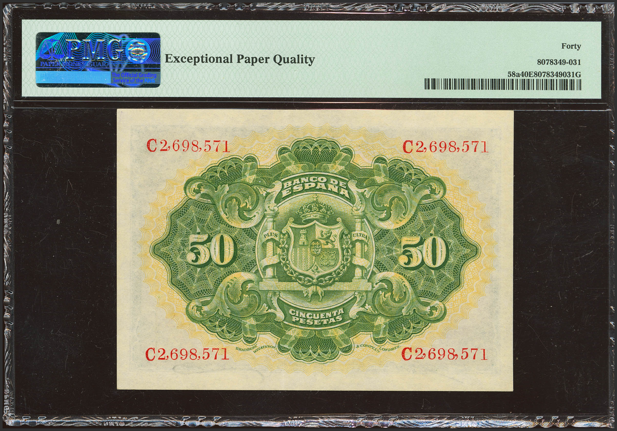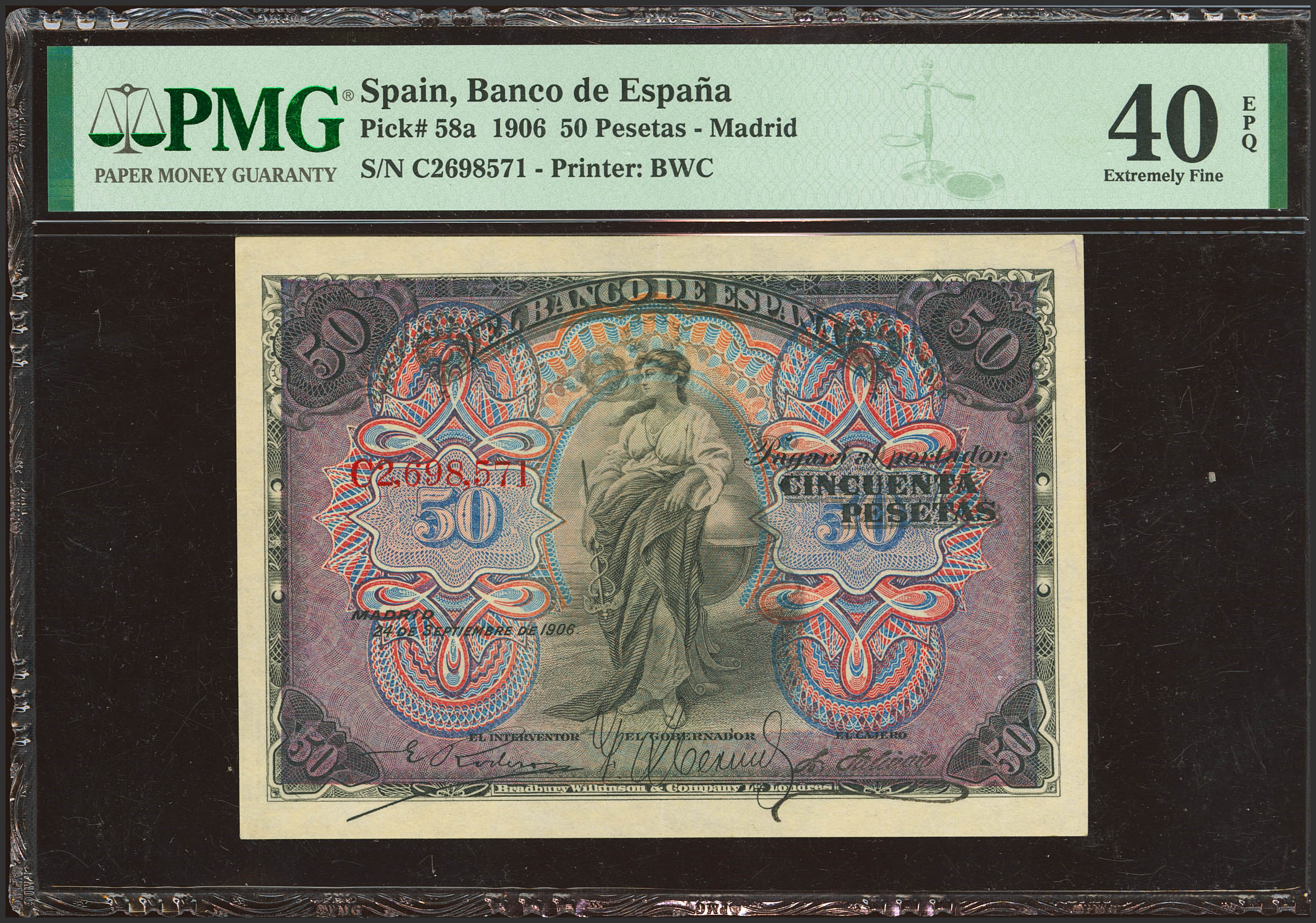 50 Pesetas. 24 de Septiembre de 1906. Serie C, última serie emitida. (Edifil 2023: 315a, Pick: 58a). Apresto original. EBC-. Encapsulado PMG40EPQ.