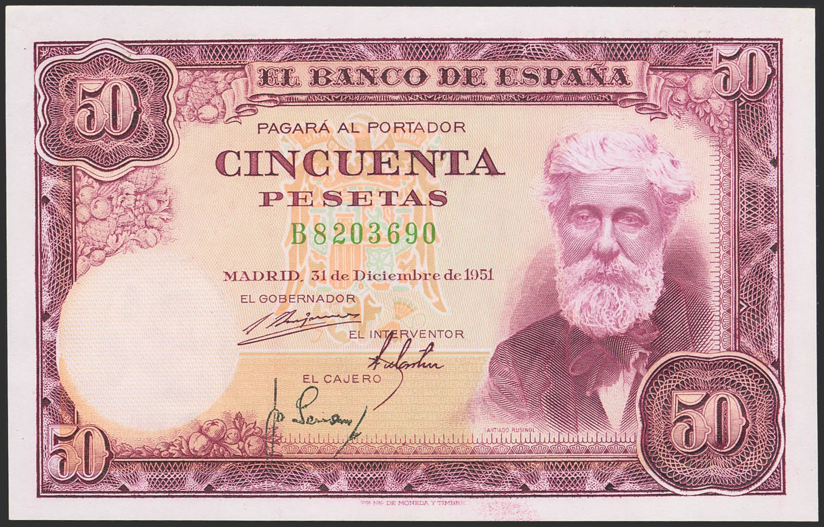 50 Pesetas. 31 de Diciembre de 1951. Serie B. (Edifil 2023: 462a, Pick: 141a). Conserva gran parte de su apresto original. EBC+.