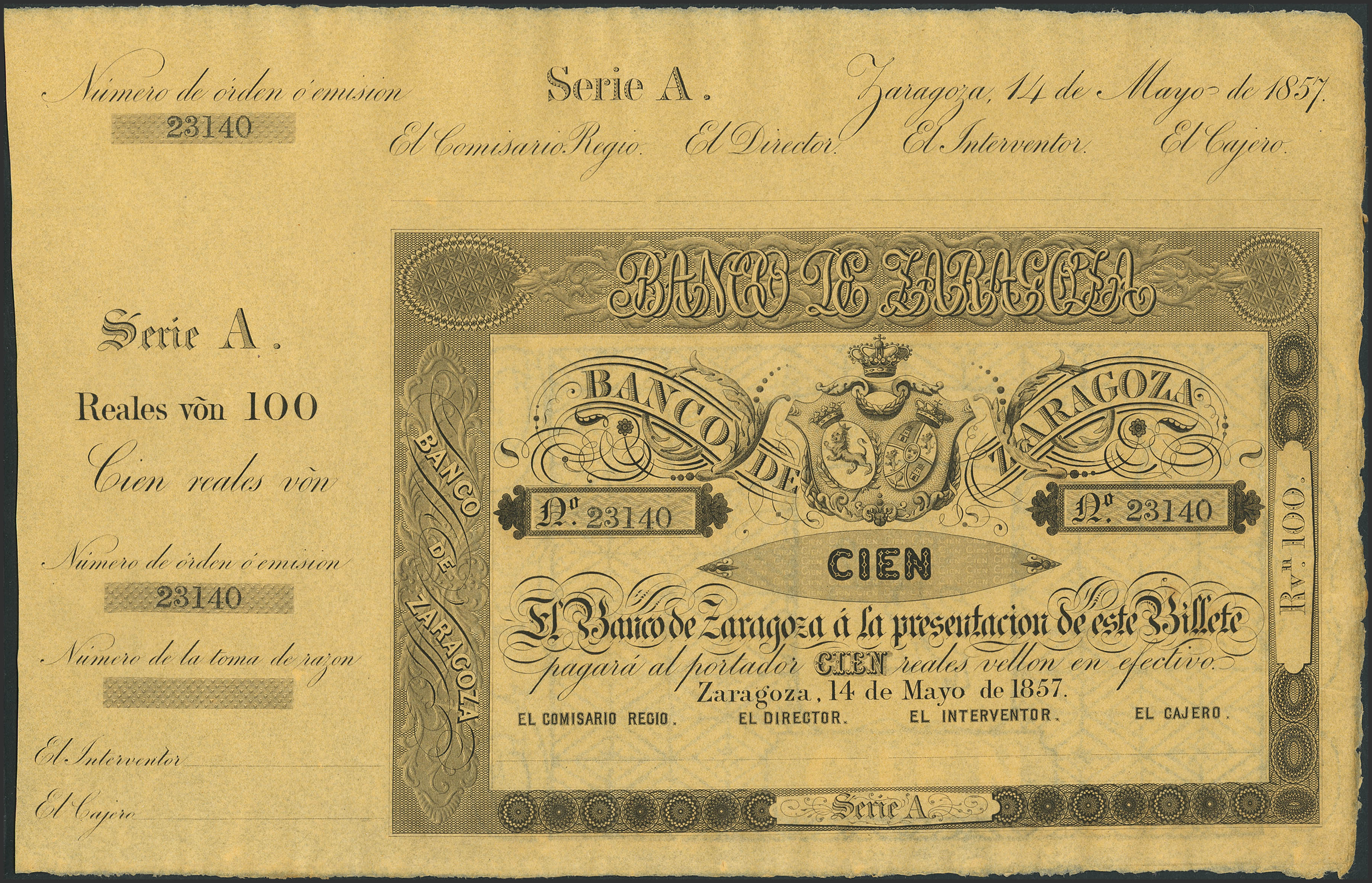 100 Reales. 14 de Mayo de 1857. Banco de Zaragoza. Serie A y con matriz. (Edifil 2023: 126B). Apresto original. SC-.