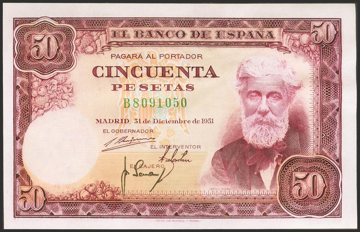 50 Pesetas. 31 de Diciembre de 1951. Serie B. (Edifil 2021: 462a). Conserva todo su apresto original. SC--.
