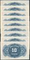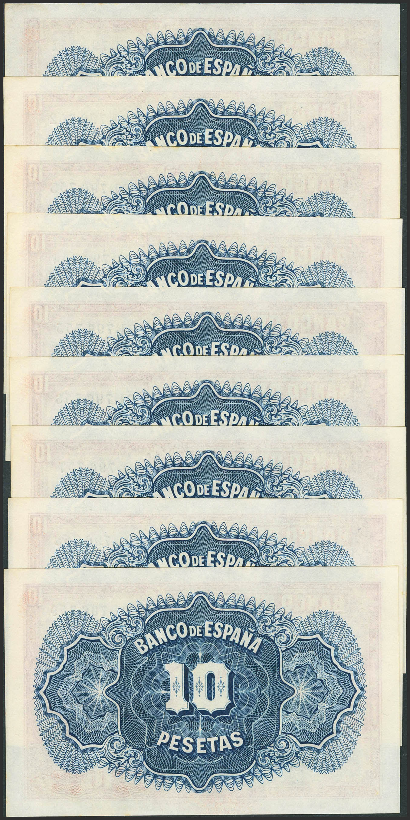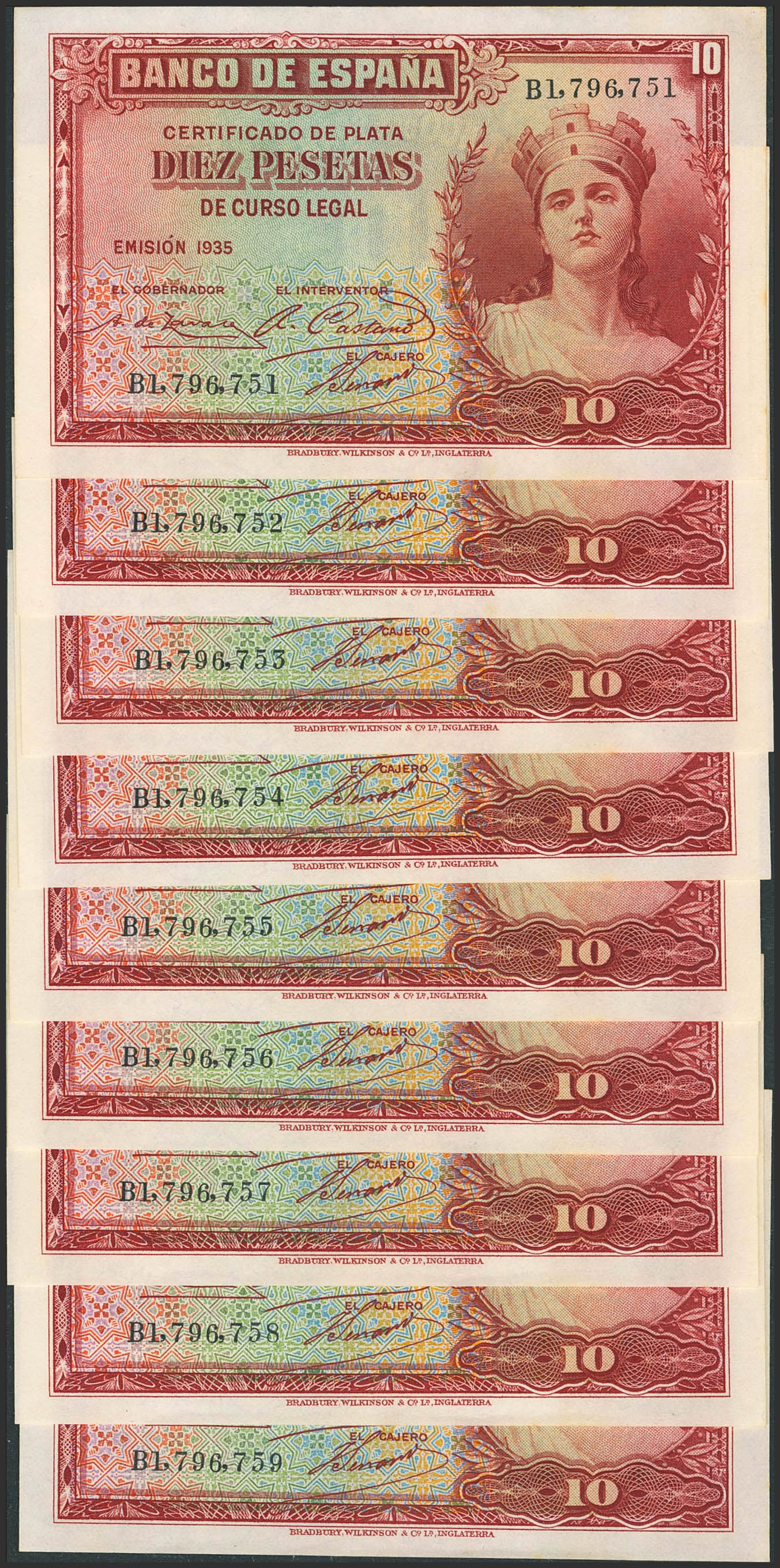 Conjunto de 9 billetes correlativos de 10 Pesetas Certificado de Plata emitidos en 1935 y con la serie B (Edifil 2021: 364a), conservando todo su apresto original. SC.