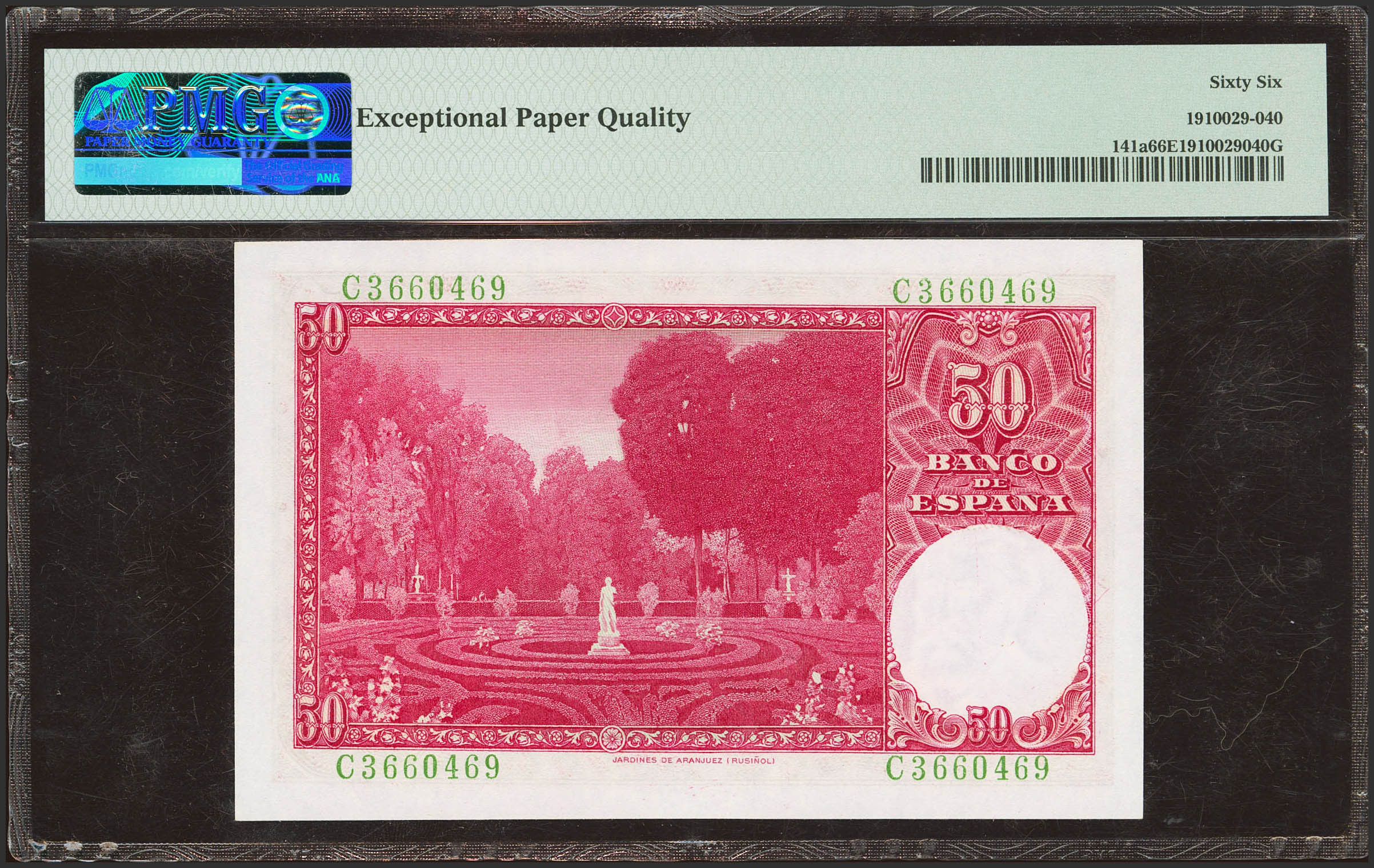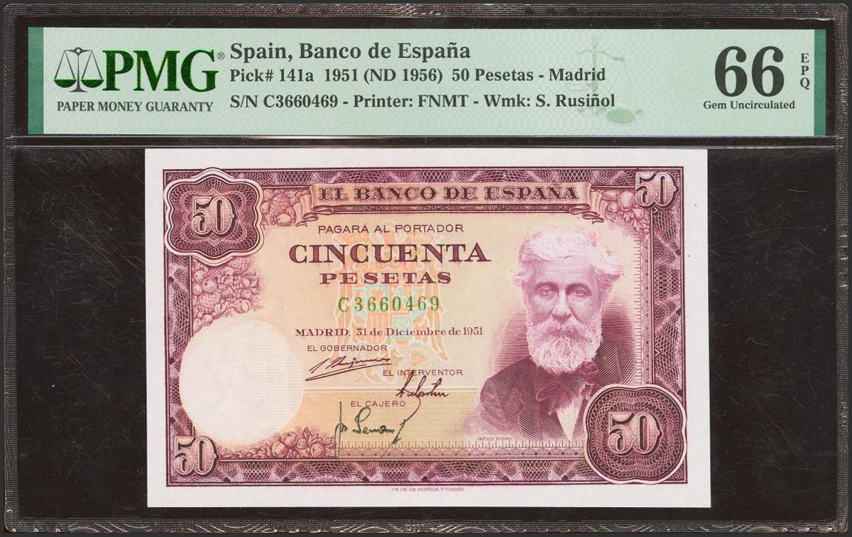 50 Pesetas. 31 de Diciembre de 1951. Serie C. (Edifil 2023: 462a, Pick: 141a). Inusual en esta calidad, apresto original. SC. Encapsulado PMG66EPQ.