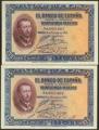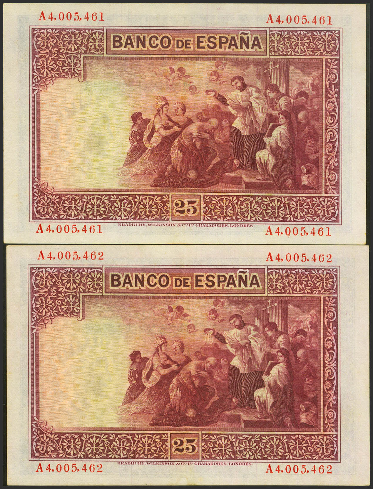 25 Pesetas. 12 de Octubre de 1926. Pareja correlativa. Serie A. (Edifil 2021: 325a). Inusual en esta calidad, conserva parte de su apresto original. EBC+.