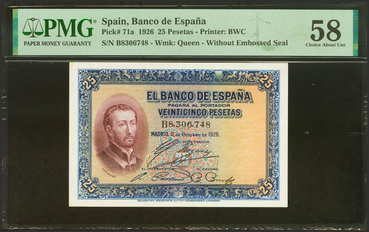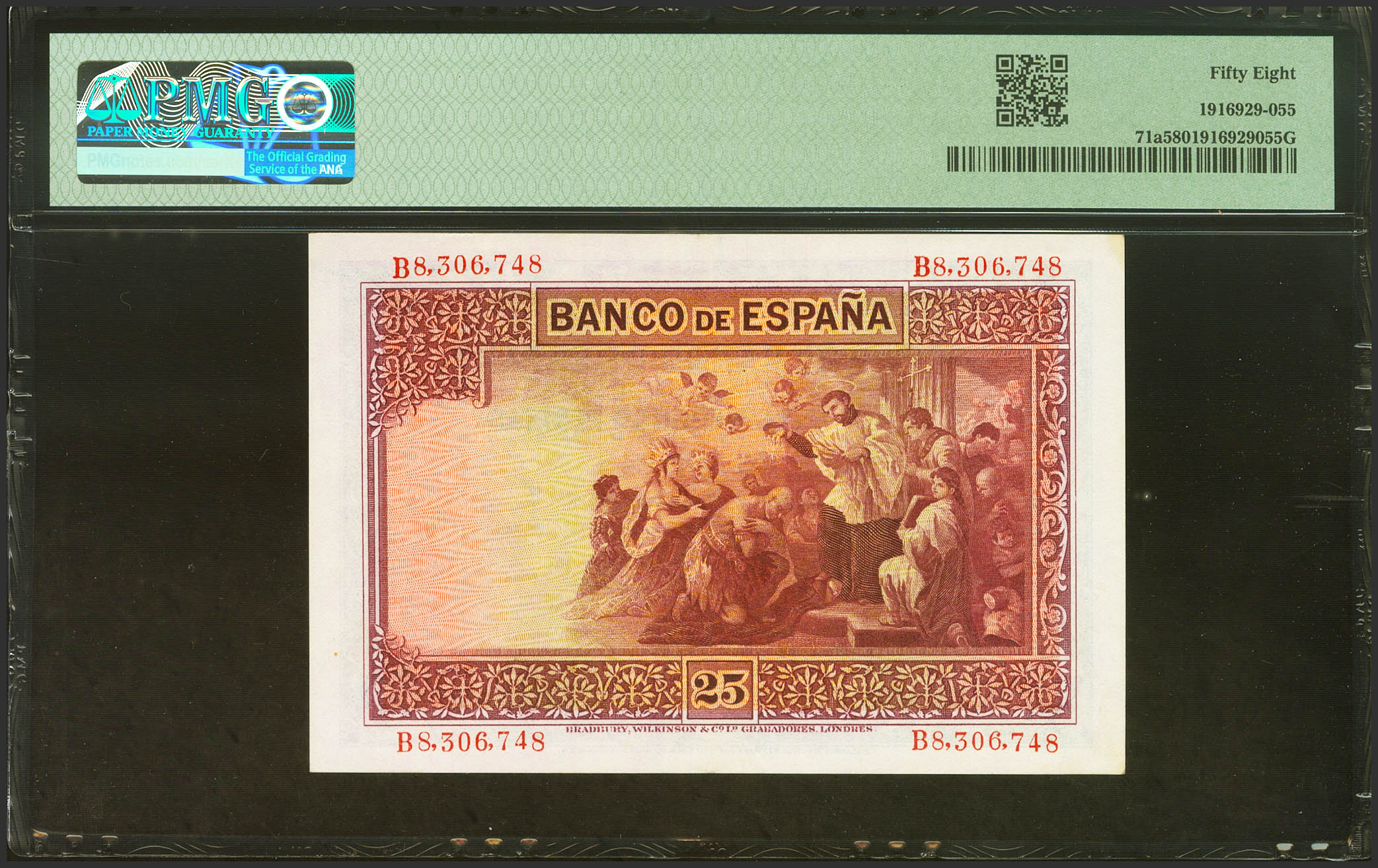 25 Pesetas. 12 de Octubre de 1926. Serie B, última serie emitida. (Edifil 2023: 325a, Pick: 71a). Inusual en esta calidad. EBC++. Encapsulado PMG58.