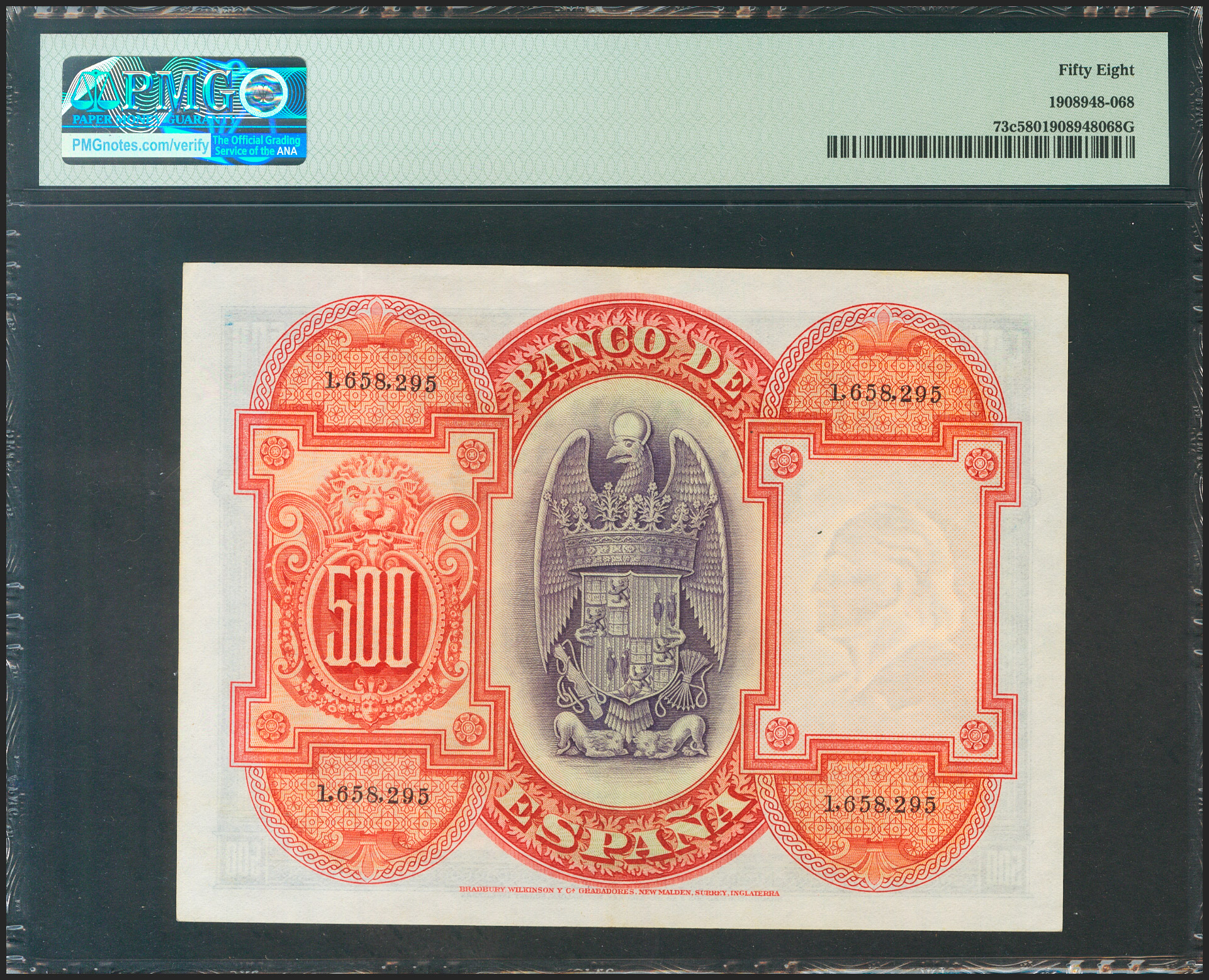500 Pesetas. 24 de Julio de 1927. Sin serie y numeración posterior al 1602000. (Edifil 2021: 352, Pick: 73c). Inusual en esta calidad. EBC++. Encapsulado PMG58.