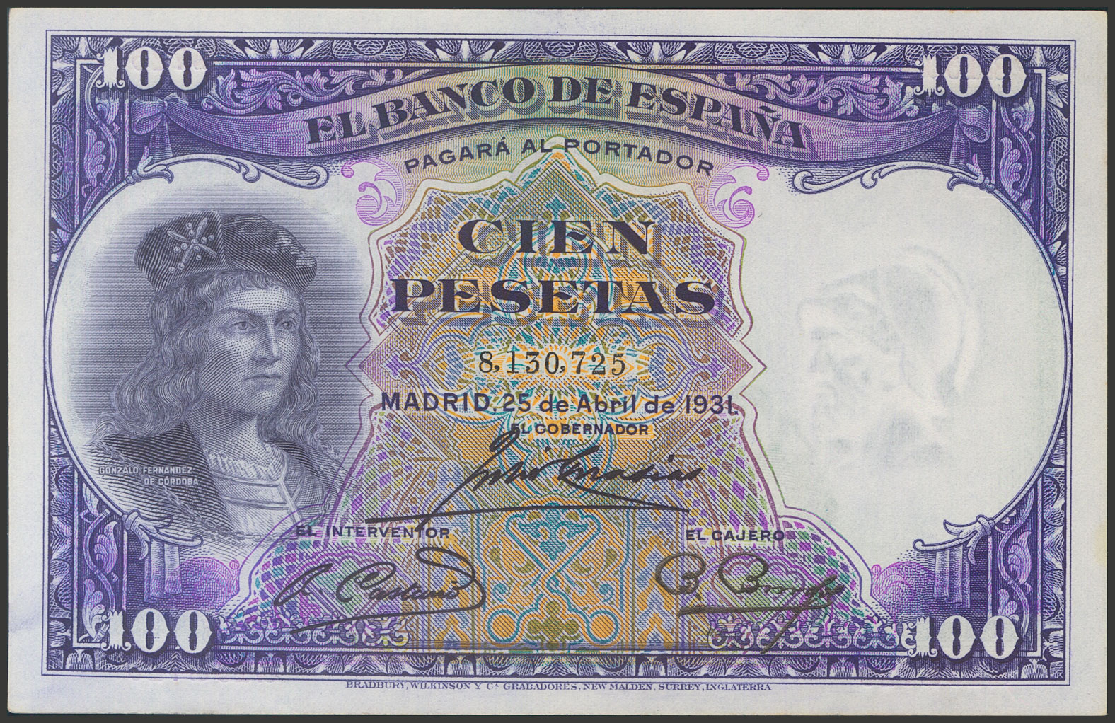 100 Pesetas. 25 de Abril de 1931. Sin serie. (Edifil 2017: 360). Conserva todo su apresto original. SC-.