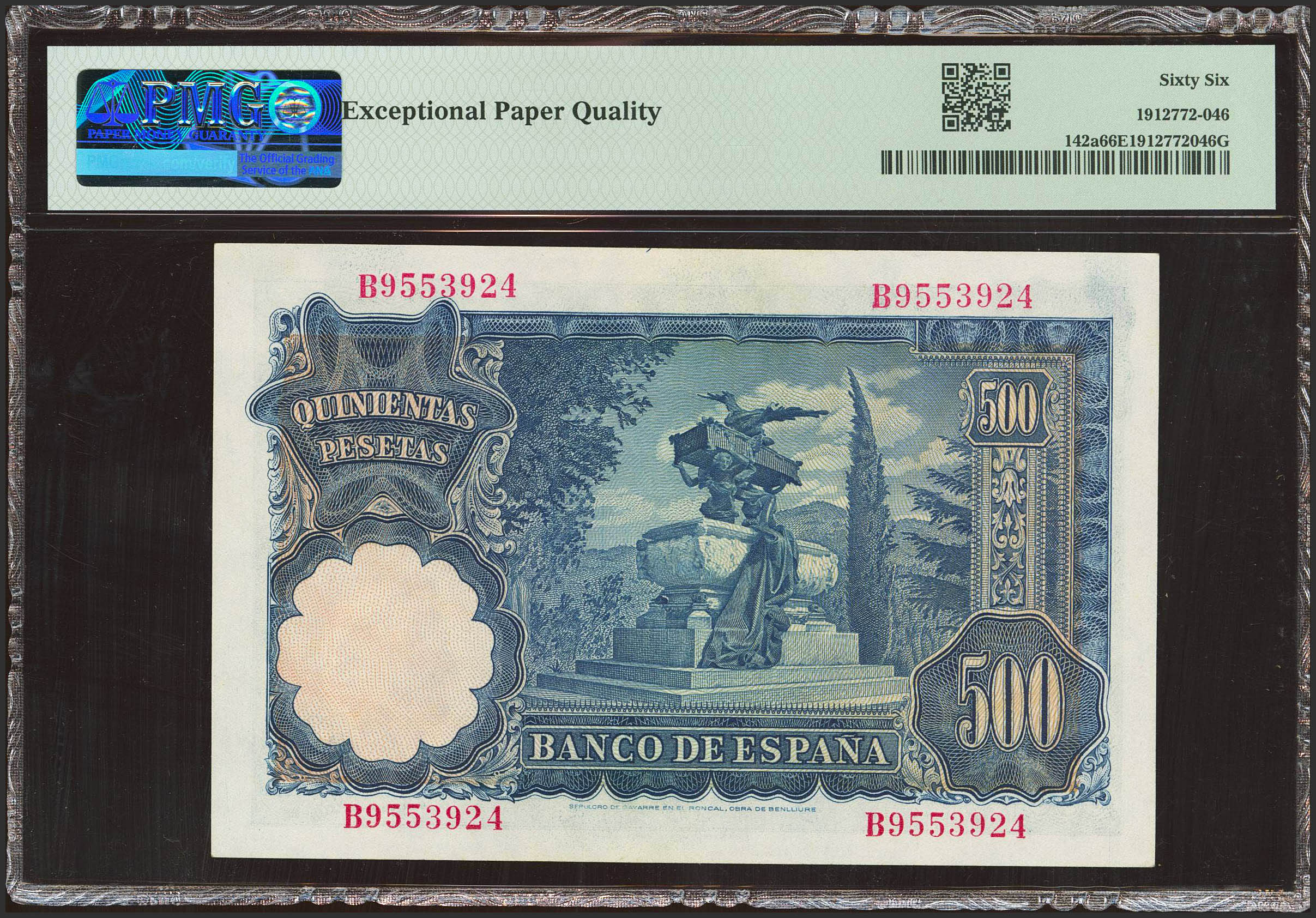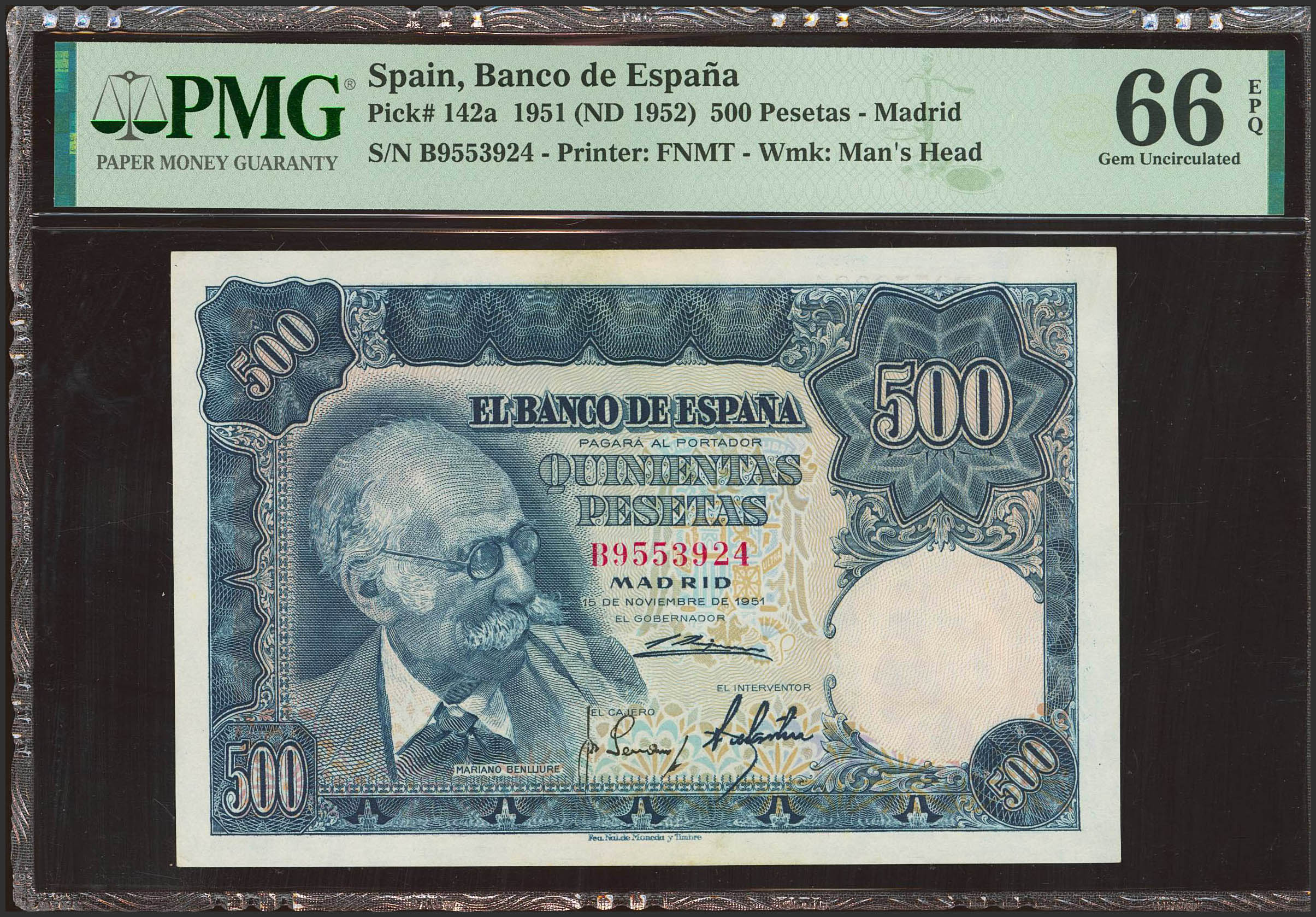 500 Pesetas. 15 de Noviembre de 1951. Serie B. (Edifil 2021: 460a, Pick: 142a). RarÃsimo en esta excepcional calidad, apresto original. SC. Encapsulado PMG66EPQ.