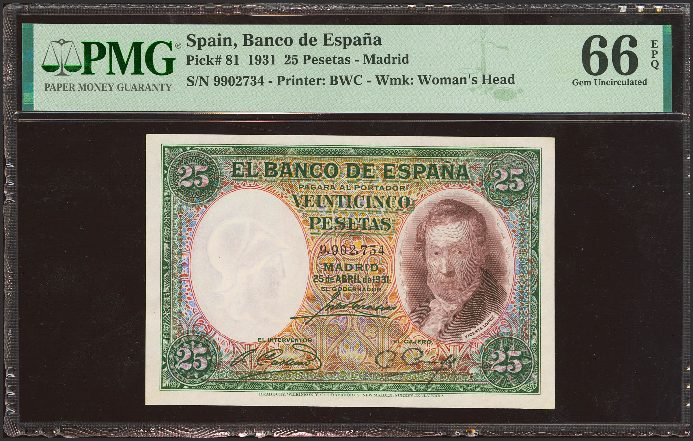 25 Pesetas. 25 de Abril de 1931. Sin serie. (Edifil 2021: 358, Pick: 81). Raro en esta excepcional calidad, apresto original. SC. Encapsulado PMG66EPQ.