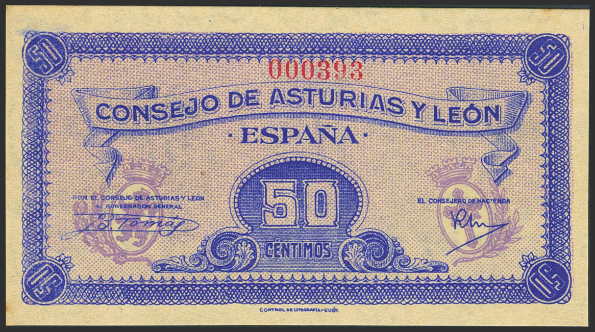 50 Céntimos. 1937. Asturias y León. Sin serie y numeración baja (Nº000393). (Edifil 2023: 396). Muy raro en esta calidad, apresto original y habituales manchitas del tiempo. SC-.