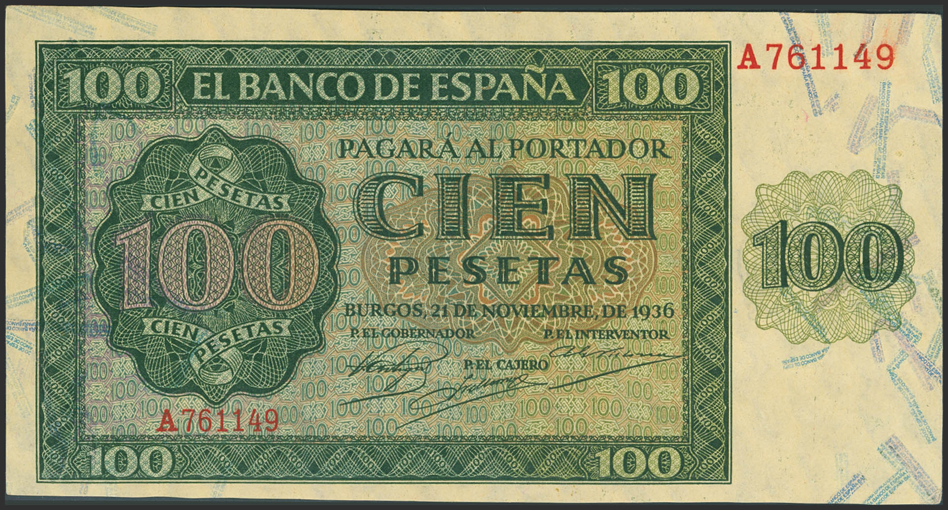 100 Pesetas. 21 de Noviembre de 1936. Serie A. (Edifil 2023: 421). Conserva gran parte de su apresto original. EBC+++.