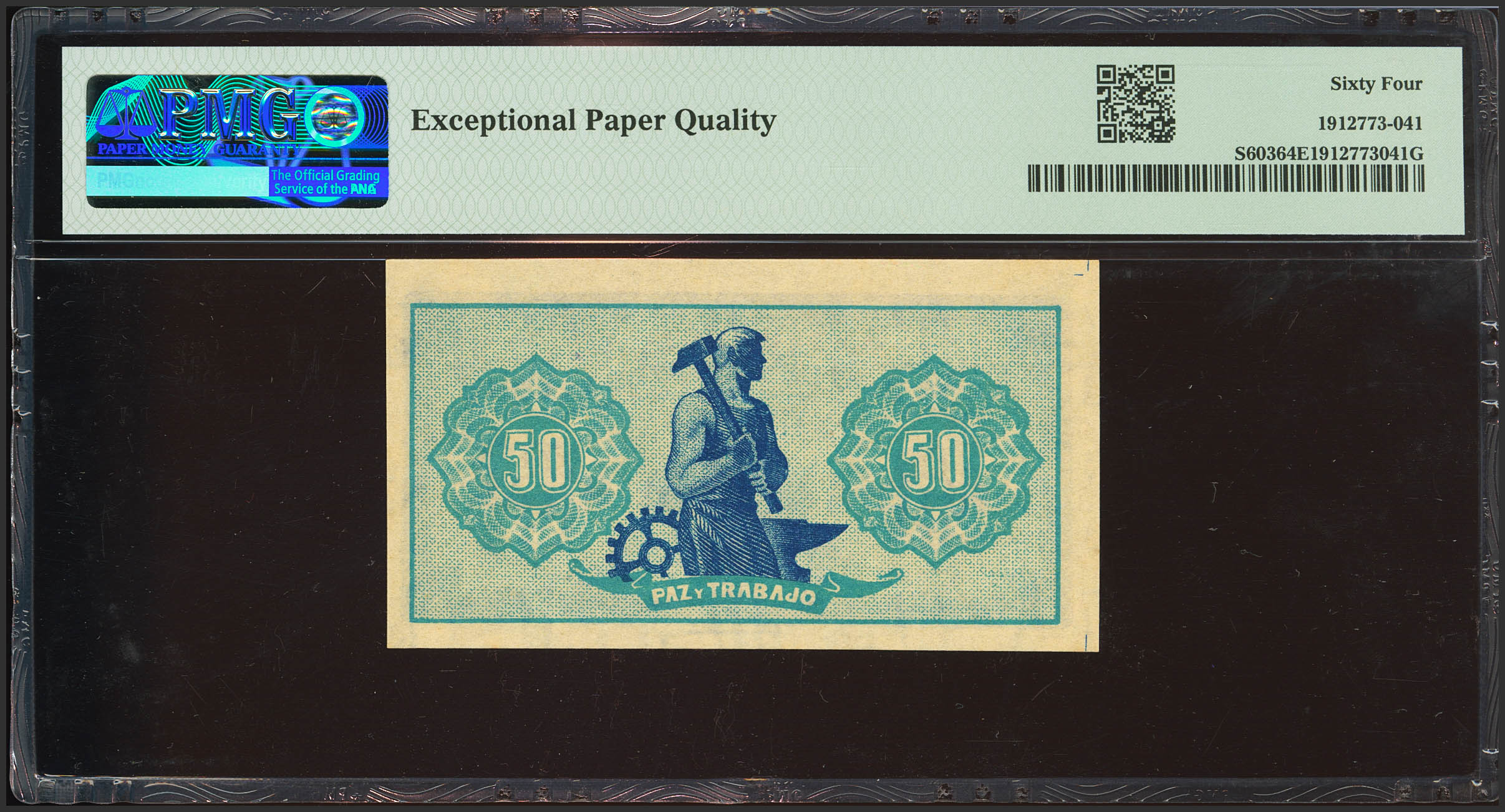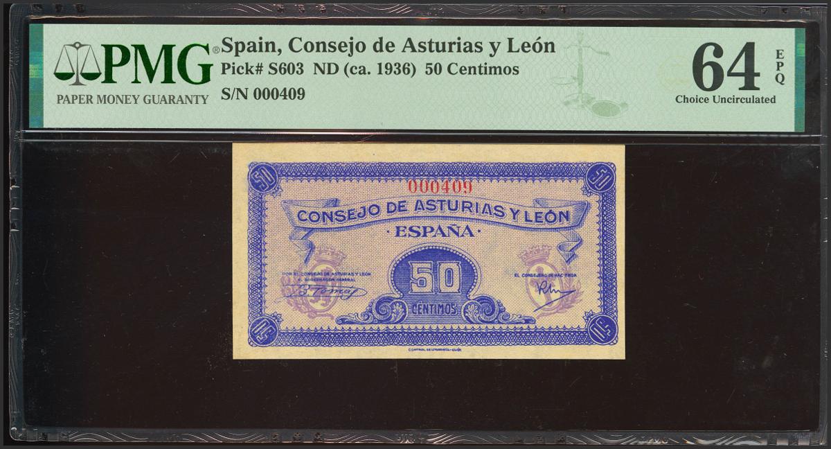 50 Céntimos. 1937. Asturias y León. Sin serie y numeración bajÃsima. (Edifil 2021: 396, Pick: S603). RarÃsimo, especialmente en esta excepcional calidad, apresto original. SC. Encapsulado PMG64EPQ.