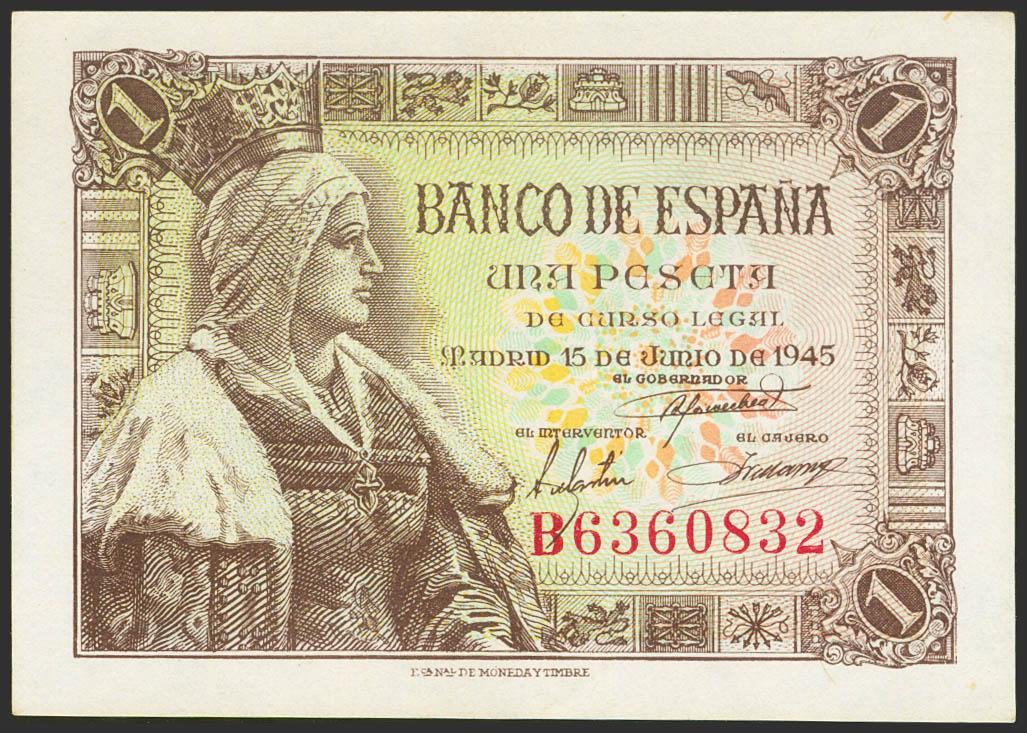 1 Peseta. 15 de Junio de 1945. Serie B. (Edifil 2021: 448a). Apresto original. SC.