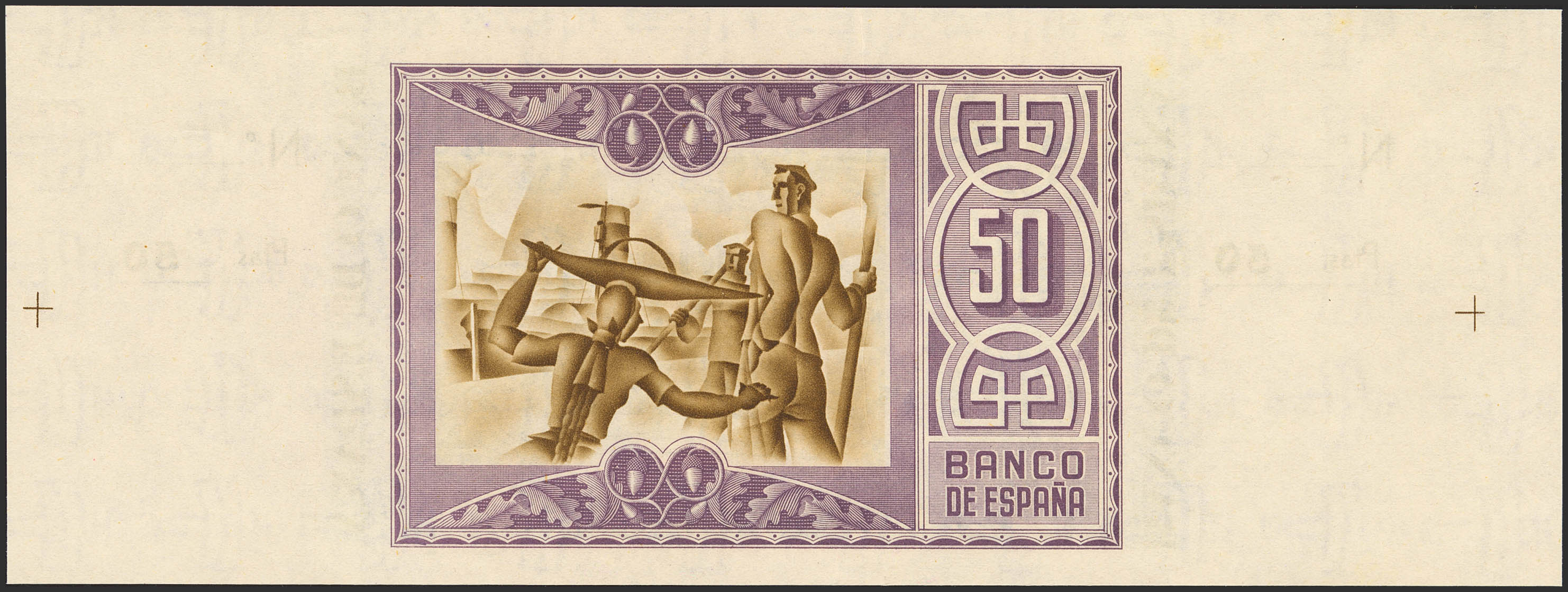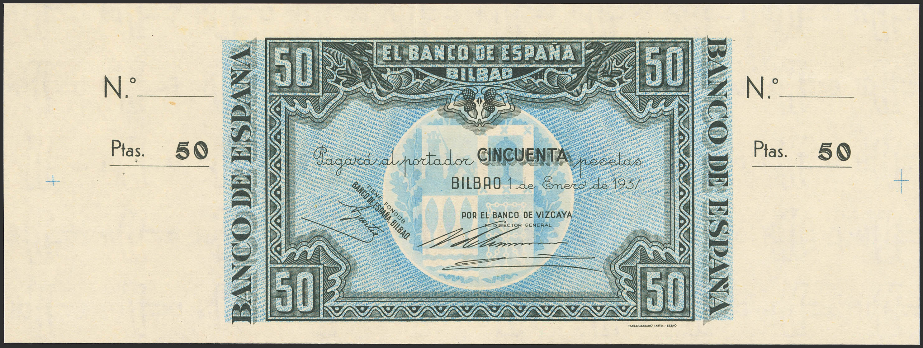 50 Pesetas. 1 de Enero de 1937. Sucursal de Bilbao, antefirma Banco de Vizcaya. Sin serie y sin numeración, con ambas matrices. (Edifil 2023: 389b). EBC.