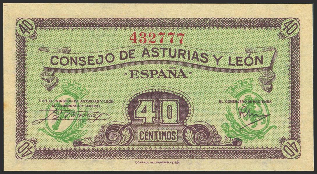 40 Céntimos. 1937. Asturias y León. Sin serie. (Edifil 2023: 395). Apresto original, habituales manchitas del tiempo. SC-.