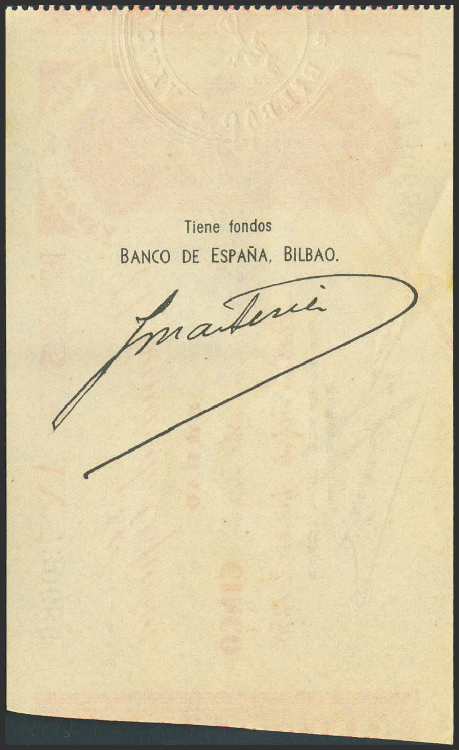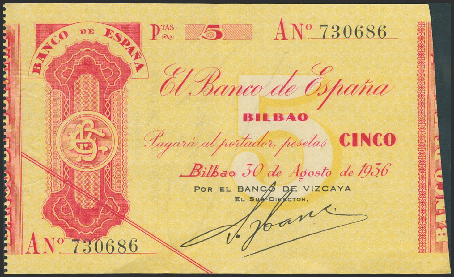 5 Pesetas. 30 de Agosto de 1936. Sucursal de Bilbao, antefirma del Banco de Vizcaya. Serie A. (Edifil 2023: 368Aa). Inusual en esta excepcional calidad, especialmente con apresto original, ondulación que no llega a romper fibra. EBC+++.