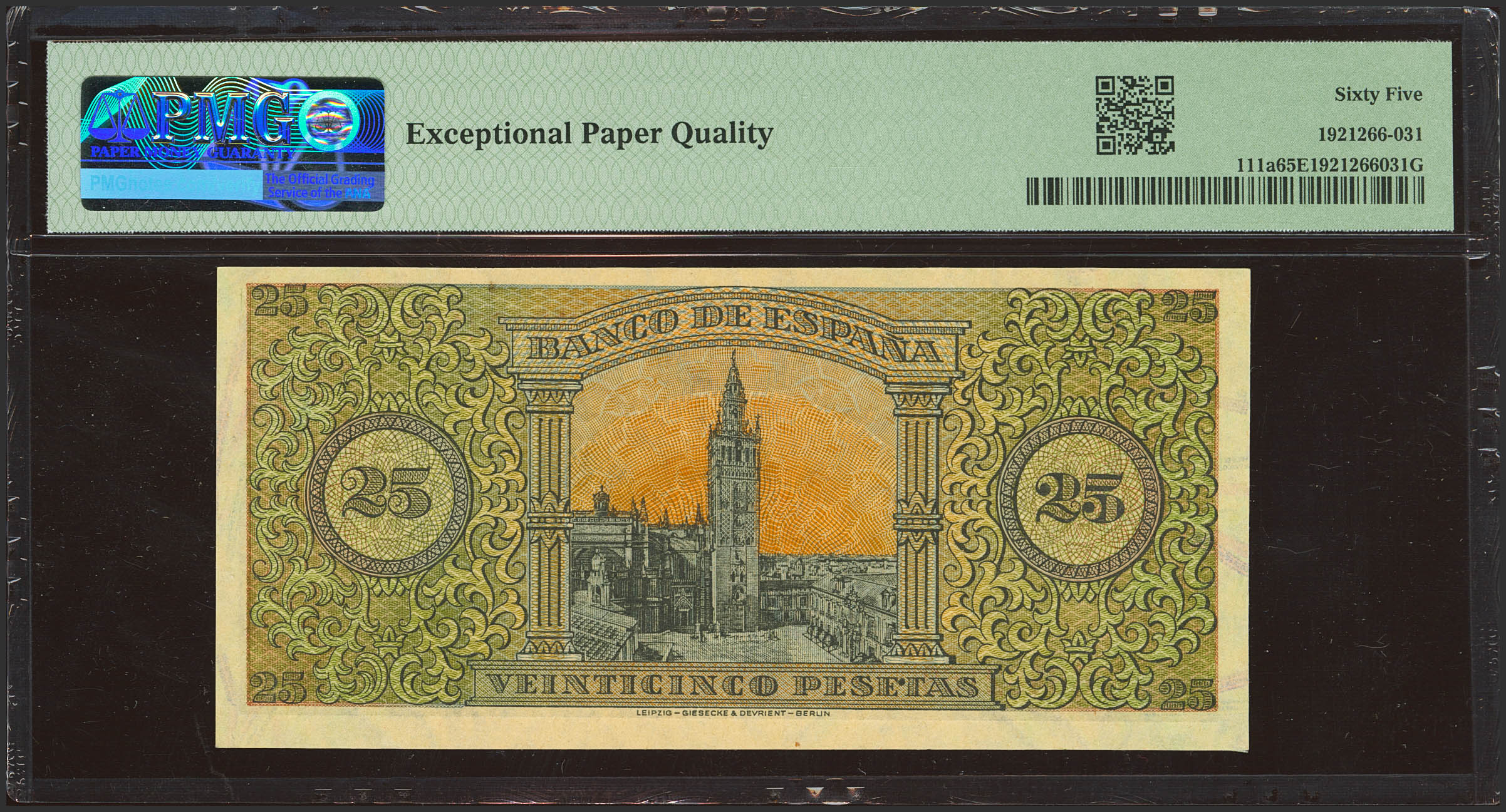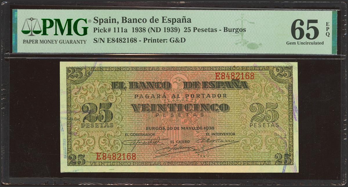 25 Pesetas. 20 de Mayo de 1938. Serie E. (Edifil 2023: 430a, Pick: 111a). Raro en esta excepcional calidad, apresto original. SC. Encapsulado PMG65EPQ.