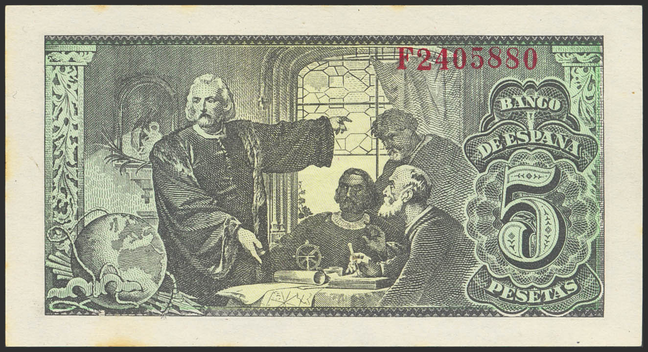 5 Pesetas. 13 de Febrero de 1943. Serie F. (Edifil 2023: 446a). Apresto original, ligeras sombras del tiempo. SC-.