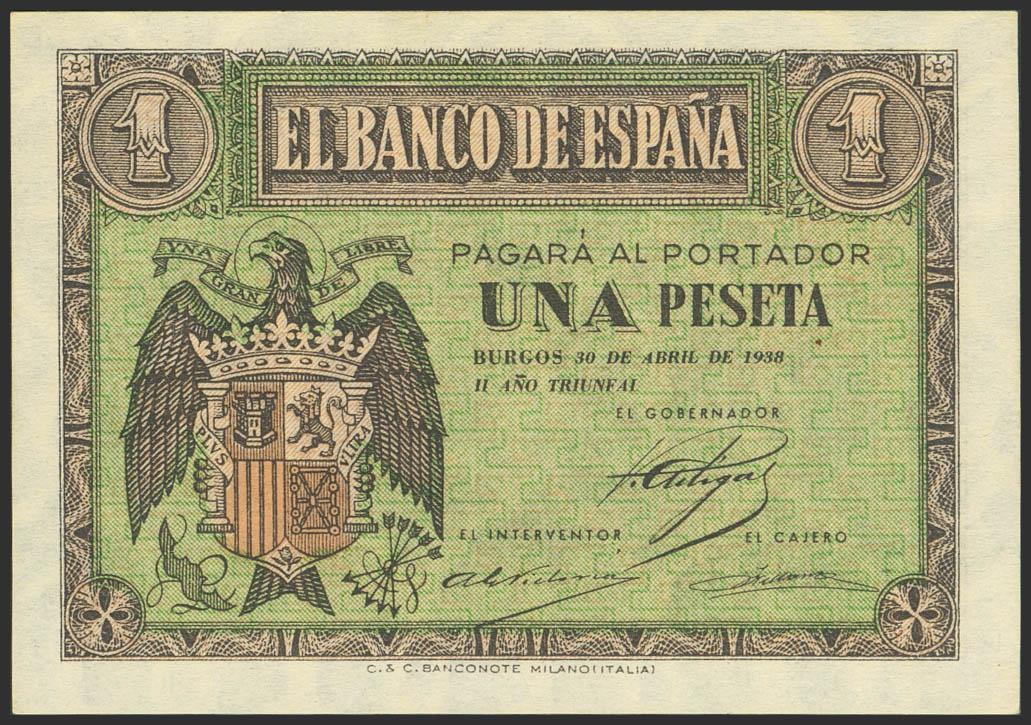 1 Peseta. 30 de Abril de 1938. Serie G. (Edifil 2023: 428a). Apresto original. SC.
