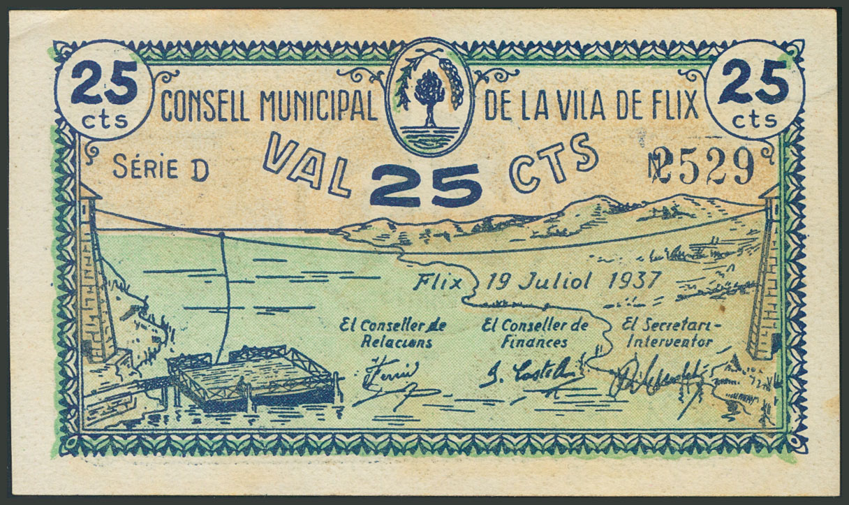 FLIX (TARRAGONA). 25 Céntimos. 19 de Julio de 1937. Serie D. (González: 7886). EBC.