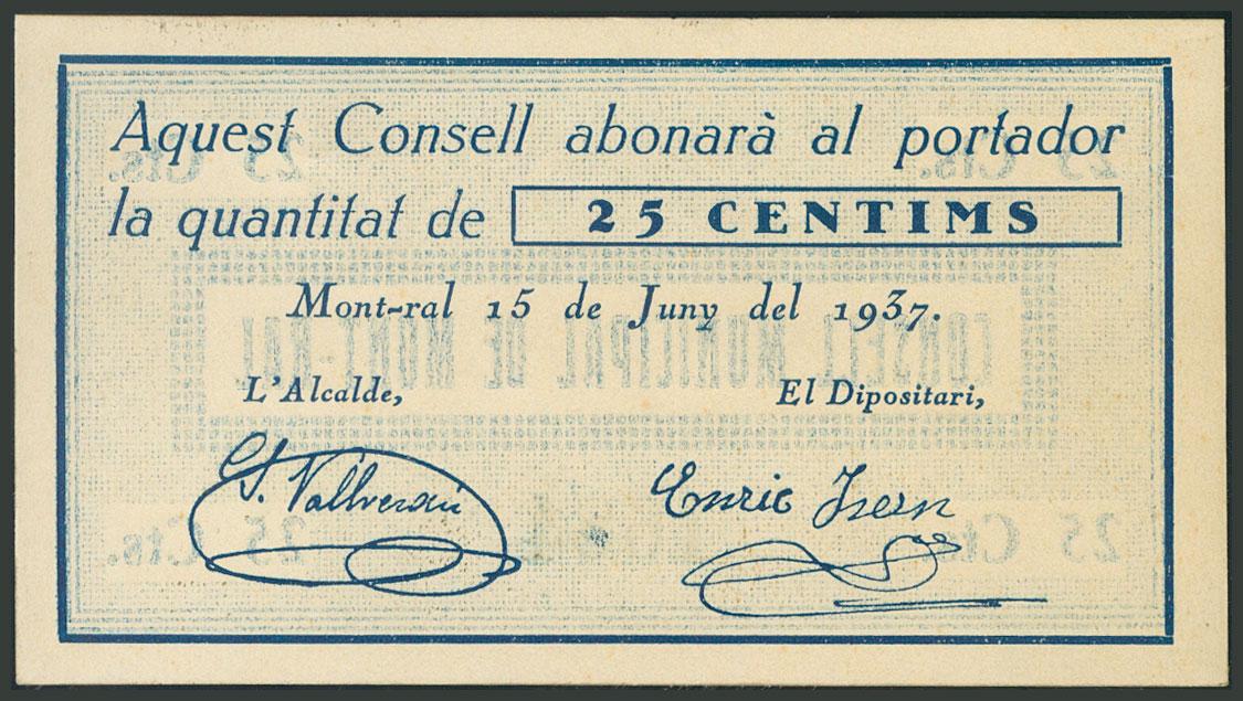 MONT-RAL (TARRAGONA). 25 Céntimos. 15 de Junio de 1937. (González: 8811). EBC.