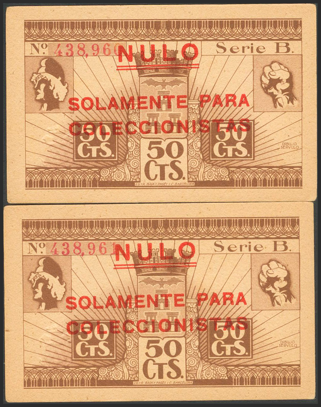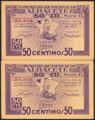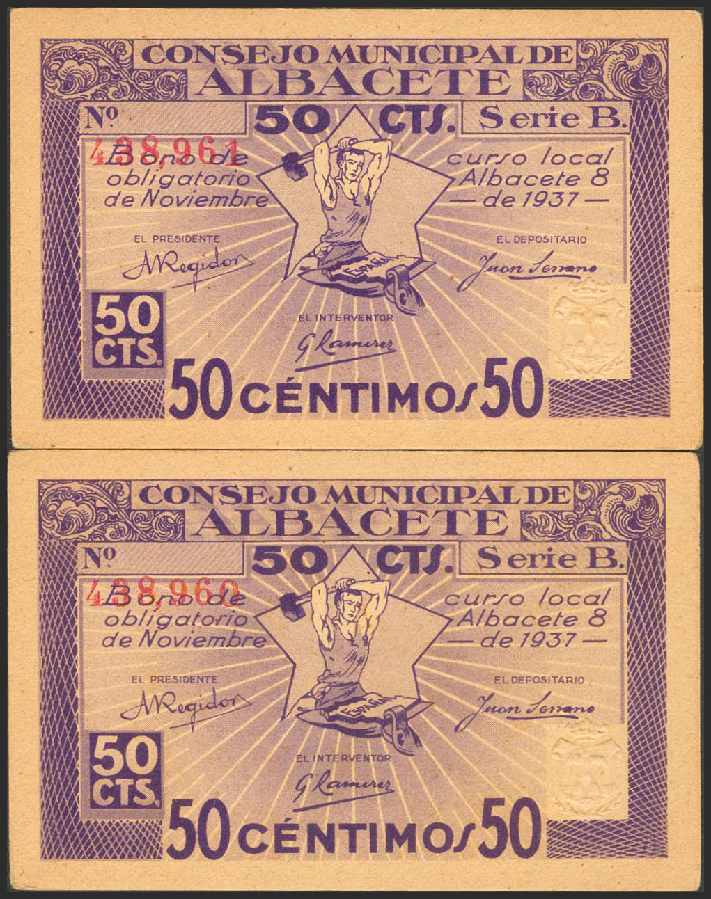 ALBACETE. 50 Céntimos. 8 de Noviembre de 1937. Pareja correlativa. Tampón "Nulo solamente para coleccionistas". Serie B. (González: 131). SC.