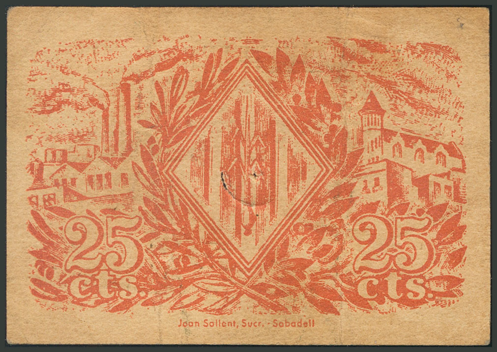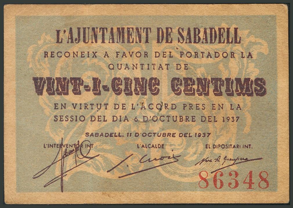 SABADELL (BARCELONA). 25 Céntimos. 11 de Octubre de 1937. (González: 9778). EBC.