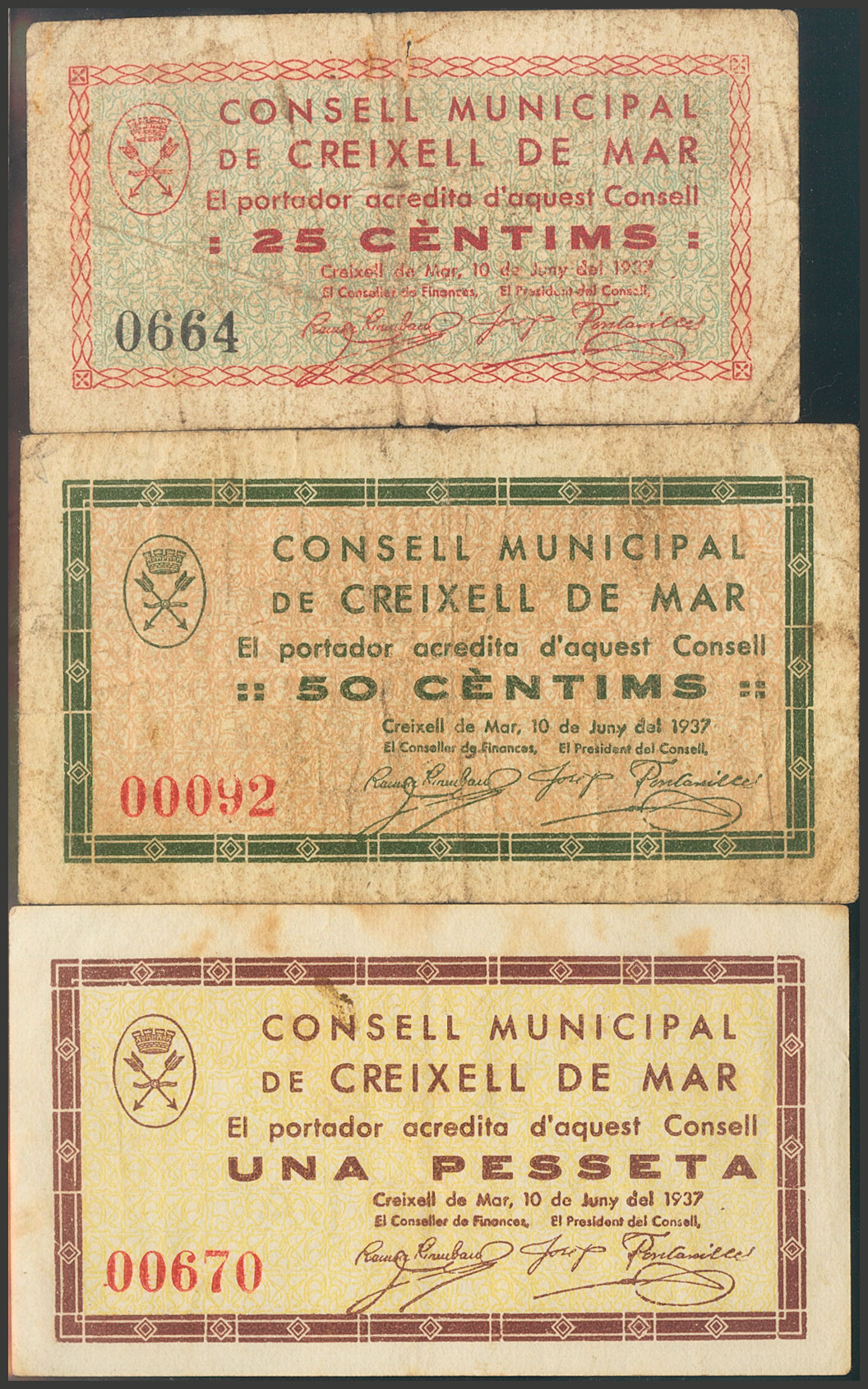 CREIXELL DE MAR (TARRAGONA). 25 Céntimos, 50 Céntimos y 1 Peseta. 10 de Junio de 1937. (González: 7700/02). Rara serie completa. BC/MBC.
