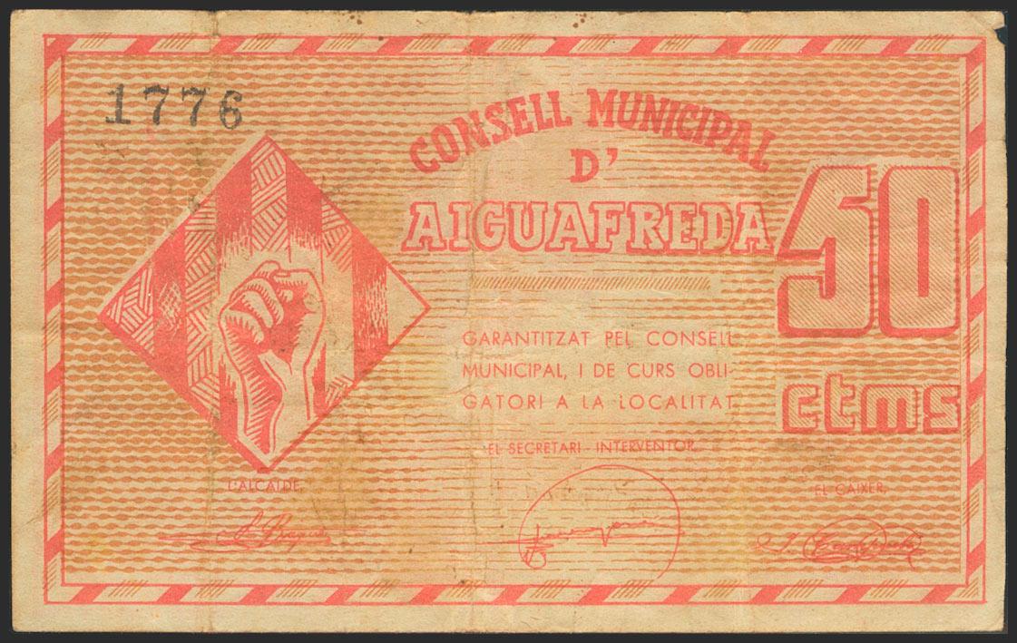 AIGUAFREDA (BARCELONA). 50 Céntimos. (1937ca). (González: 6038). Inusual. BC.