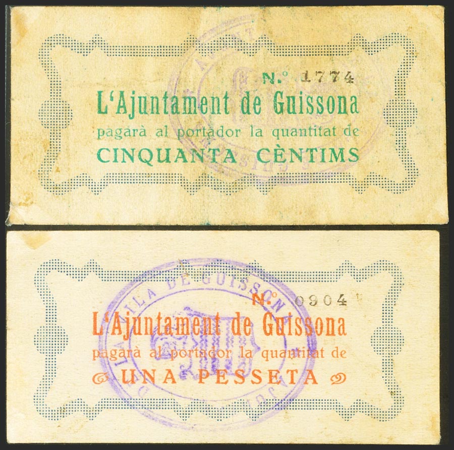 GUISSONA (LERIDA). 50 Céntimos y 1 Peseta. Junio 1937. (González: 8177/78). Rara serie completa. MBC+.