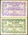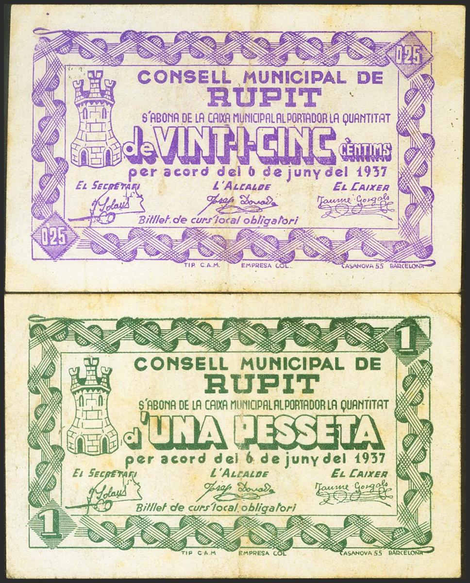 RUPIT (BARCELONA). 25 Céntimos y 1 Peseta. Junio 1937. (González: 9774/75). Rara serie completa. MBC.