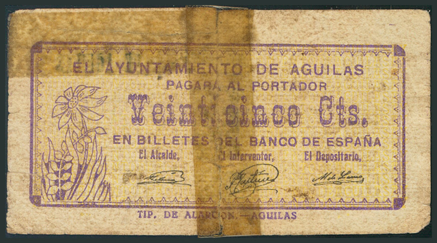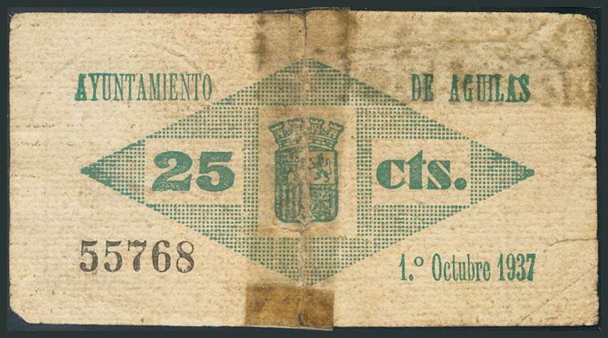 AGUILAS (MURCIA). 25 Céntimos. 1 de Enero de 1937. Sin serie. (González: 92). Cinta adhesiva. BC.