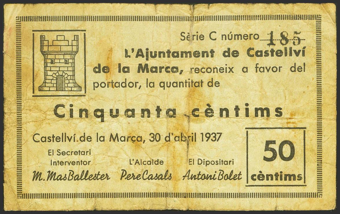CASTELLVI DE LA MARCA (BARCELONA). 50 Céntimos. 30 de Abril de 1937. Serie C. (González: 7523). Muy raro. BC.
