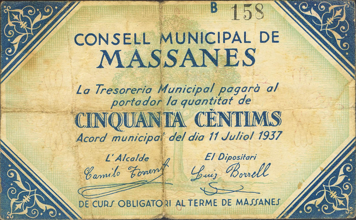 MASSANES (GERONA). 50 Céntimos. 11 de Julio de 1937. Series B. (González: 8652). Muy rara. MBC-.